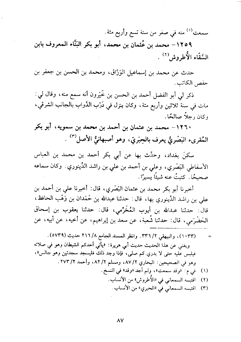 1259 - محمد بن عثمان بن محمد أبو بكر البنا المعروف بابن السقا الأطروش حدث عن: محمد بن إسماعيل الوراق، ومحمد بن الحسن بن جعفر بن حفص الكاتب.