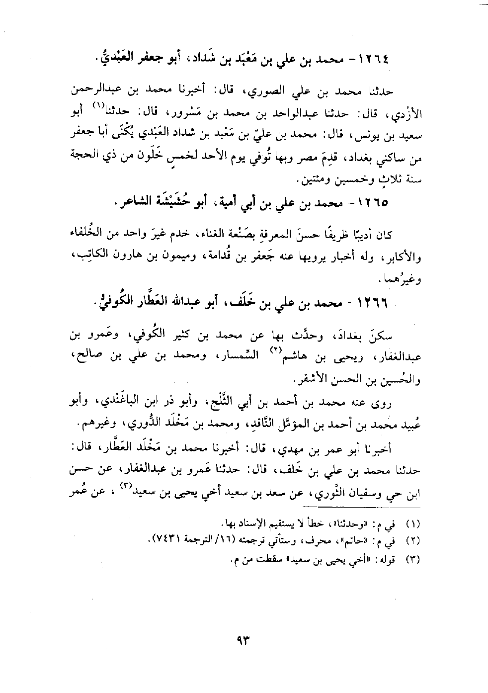 1266 - محمد بن علي بن خلف أبو عبد الله العطار الكوفي سكن بغداد، وحدث بها عن محمد بن كثير الكوفي وعمرو بن عبد الغفار ويحيى بن هاشم السمسار ومحمد بن علي بن صالح والحسين بن الحسن الأشقر.