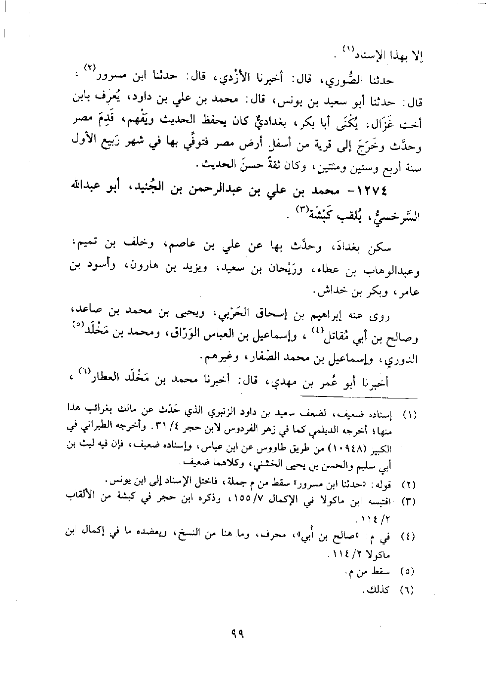 1274 - محمد بن علي بن عبد الرحمن بن الجنيد أبو عبد الله السرخسي يلقب كبشة سكن بغداد، وحدث بها عن علي بن عاصم، وخلف بن تميم، وعبد الوهاب بن عطاء، وريحان بن سعيد، ويزيد بن هارون، وأسود بن عامر، وبكر بن خداش.