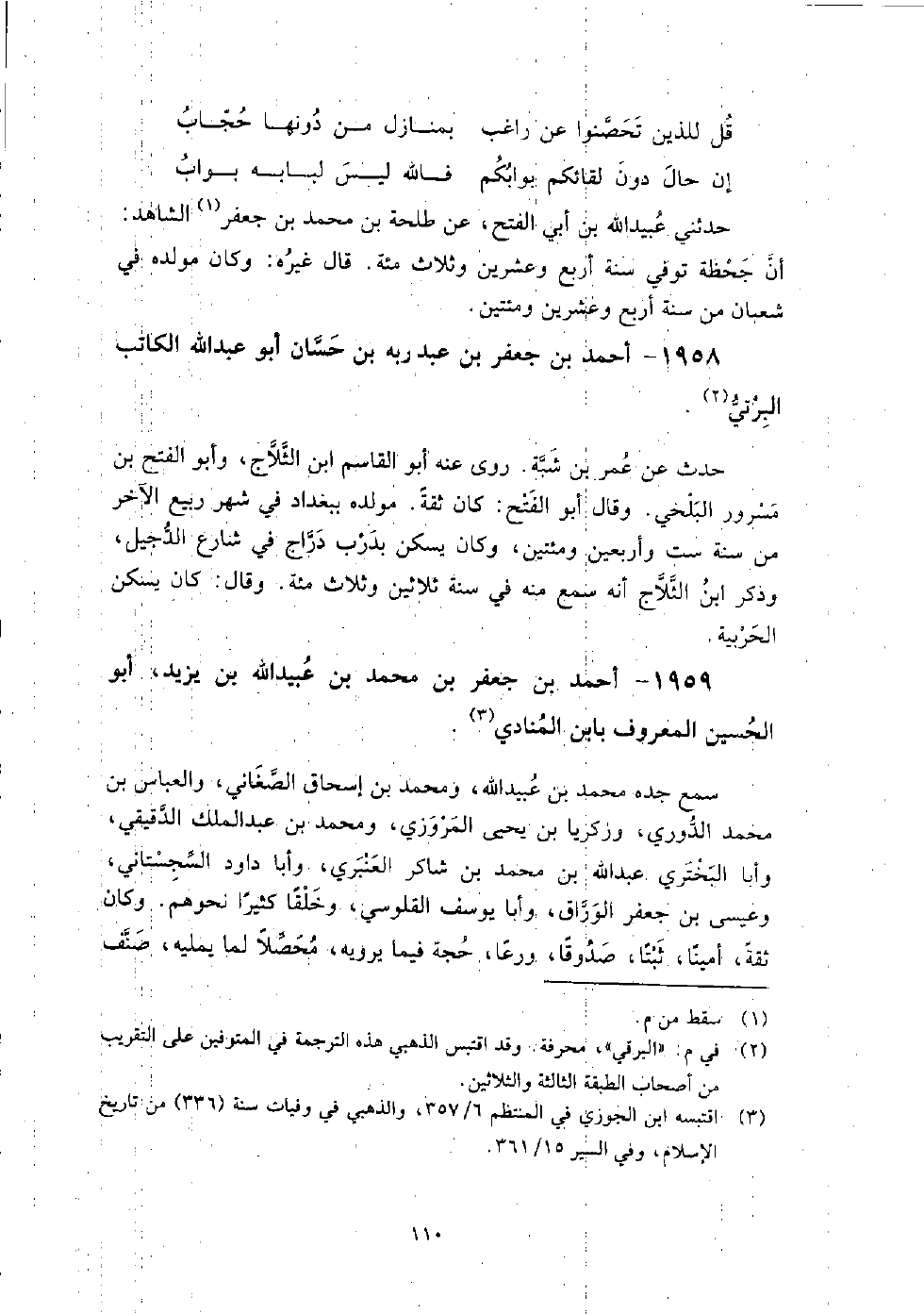 1958 - أَحْمَد بْن جعفر بْن عَبْد ربه بْن حسان أَبُو عَبْد اللَّه الكاتب البرتي حدث عَنْ عُمَر بْن شبة.