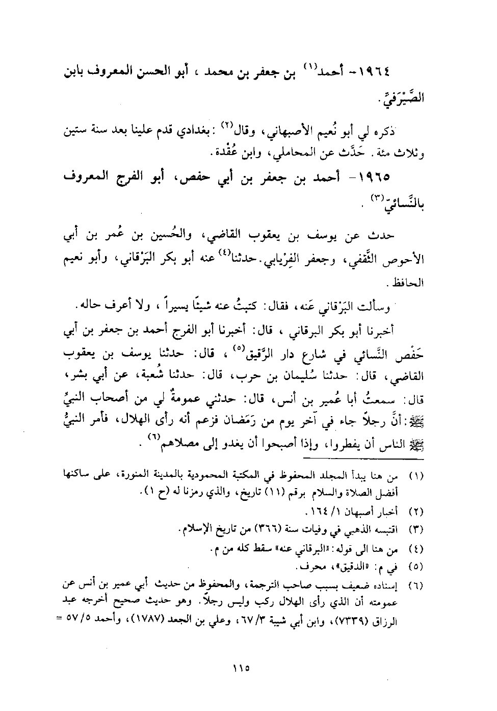 1964 - أَحْمَد بْن جعفر بْن مُحَمَّد أَبُو الْحَسَن الْمَعْرُوف بابن الصيرفي ذكره لي أَبُو نعيم الأصبهاني، وَقَالَ: بغدادي قدم عَلَيْنَا بعد سنة ستين وثلاث مائة، حدث عَنْ: المحاملي، وابن عقدة.
