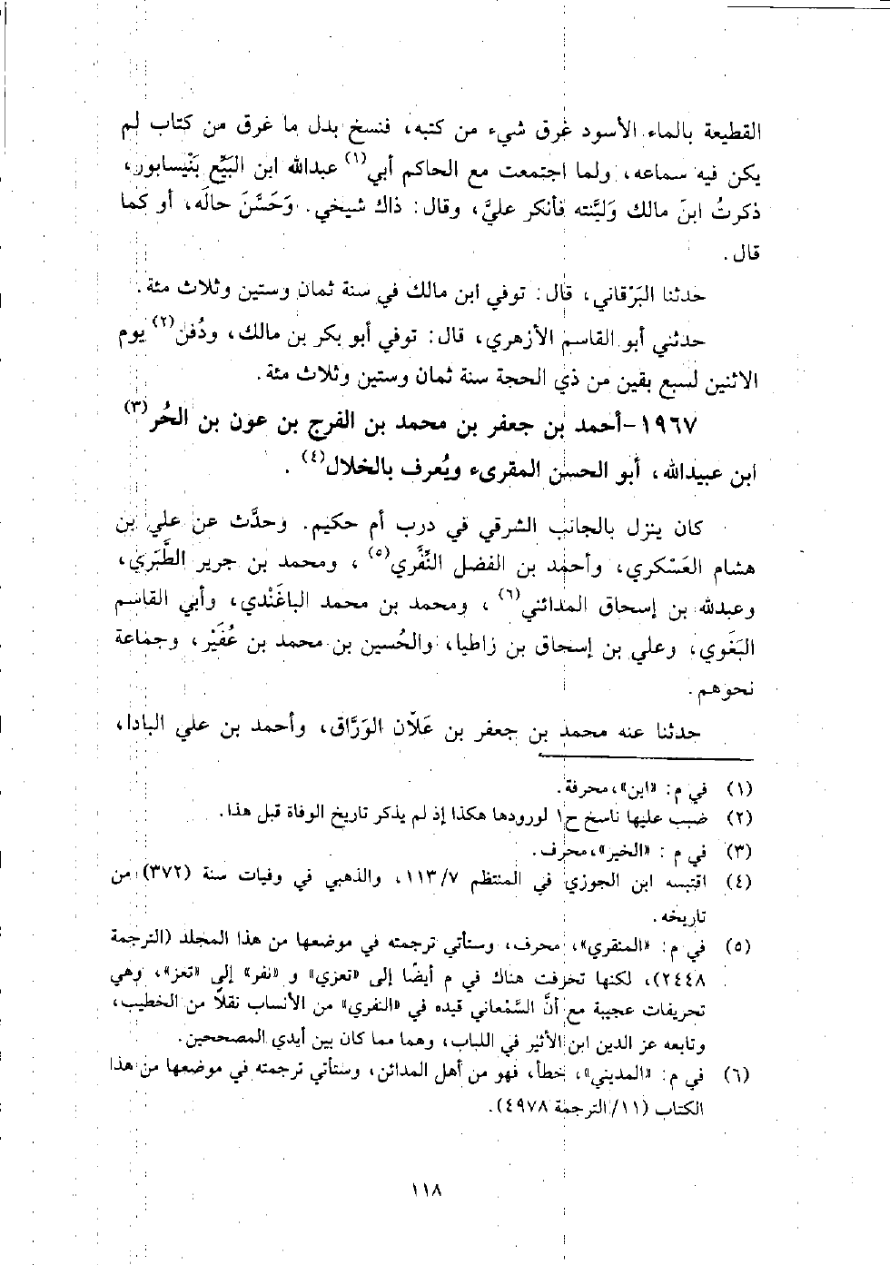 1967 - أَحْمَد بْن جعفر بْن مُحَمَّد بْن الفرج بْن عون بْن الحر بْن عُبَيْد اللَّهِ أَبُو الْحَسَن الْمُقْرِئ ويعرف بالخلال كَانَ ينزل بالجانب الشرقي فِي درب أم حَكِيم، وَحَدَّثَ عَنْ: عَلِيّ بْن هشام العسكري، وأحمد بْن الْفَضْل النِّفَّري، ومحمد بْن جرير الطبري، وَعَبْد اللَّهِ بْن إِسْحَاق المدائني، ومحمد بْن مُحَمَّد الباغندي، وأبي الْقَاسِم البغوي، وعلي بْن إِسْحَاق بْن زاطيا، وَالْحُسَيْن بْن مُحَمَّد بْن عفير، وجماعة نحوهم.