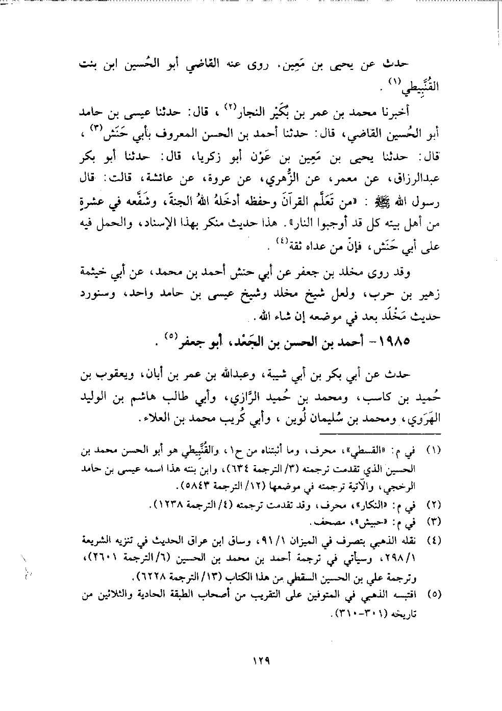 1985 - أَحْمَد بْن الْحَسَن بْن الجعد أَبُو جعفر حدث عَنْ: أَبِي بَكْر بْن أَبِي شيبة، وَعَبْد اللَّهِ بْن عُمَر بْن أبان، ويعقوب بْن حميد بْن كاسب، ومحمد بْن حميد الرَّازِيّ، وأبي طالب هاشم بْن الوليد الْهَرَوِيّ، ومحمد بْن سُلَيْمَان لوين، وأبي كريب مُحَمَّد بْن العلاء.