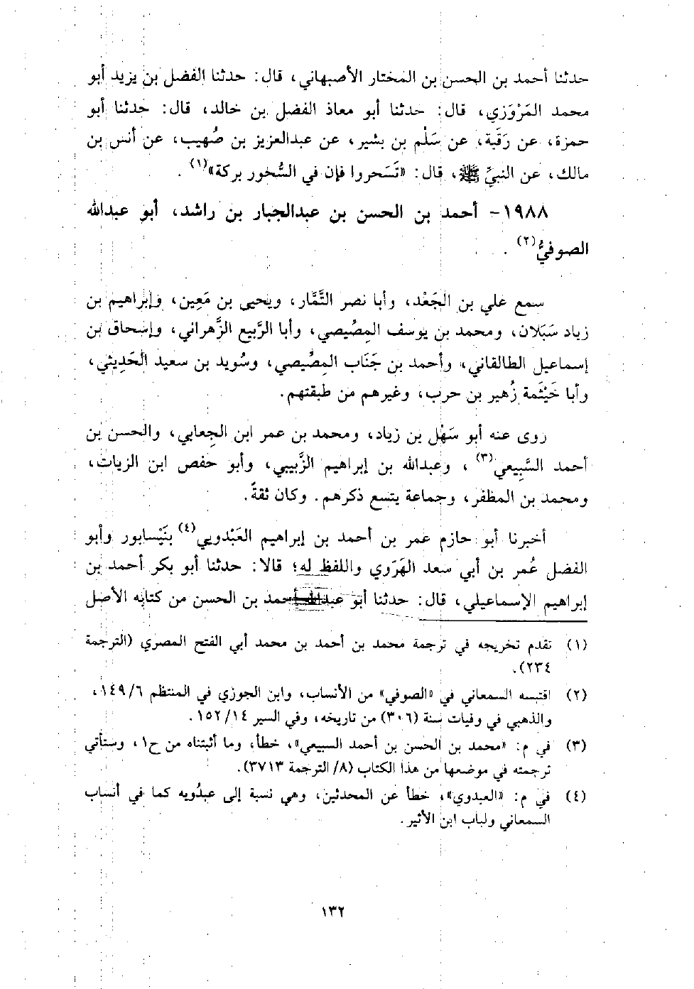 1988 - أَحْمَد بْن الْحَسَن بْن عَبْد الجبار بْن راشد أَبُو عَبْد اللَّه الصوفي سمع عَلِيّ بْن الجعد، وَأَبَا نصر التمار، ويحيى بْن معين، وإبراهيم بْن زياد سبلان، ومحمد بْن يوسف المِصِّيصي، وَأَبَا الربيع الزهراني، وإسحاق بْن إِسْمَاعِيل الطالقاني، وأحمد بْن جناب المصيصي، وسويد بْن سَعِيد الحديثي، وَأَبَا خيثمة زهير بْن حرب، وغيرهم من طبقتهم.