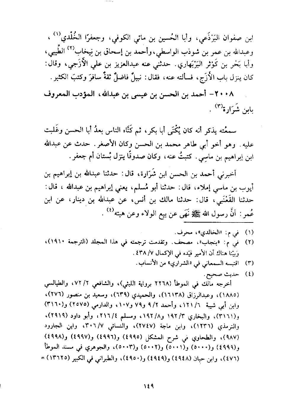 2008 - أَحْمَد بْن الْحَسَن بْن عِيسَى بْن عَبْد اللَّه المؤدب الْمَعْرُوف بابن شرارة سمعته يذكر أنه كَانَ يكنى أَبَا بَكْر، ثم كناه الناس بعد أَبَا الْحَسَن وغلبت عَلَيْهِ وهو أخو أَبِي طَاهِر مُحَمَّد بْن الْحَسَن، وَكَانَ الأصغر.
