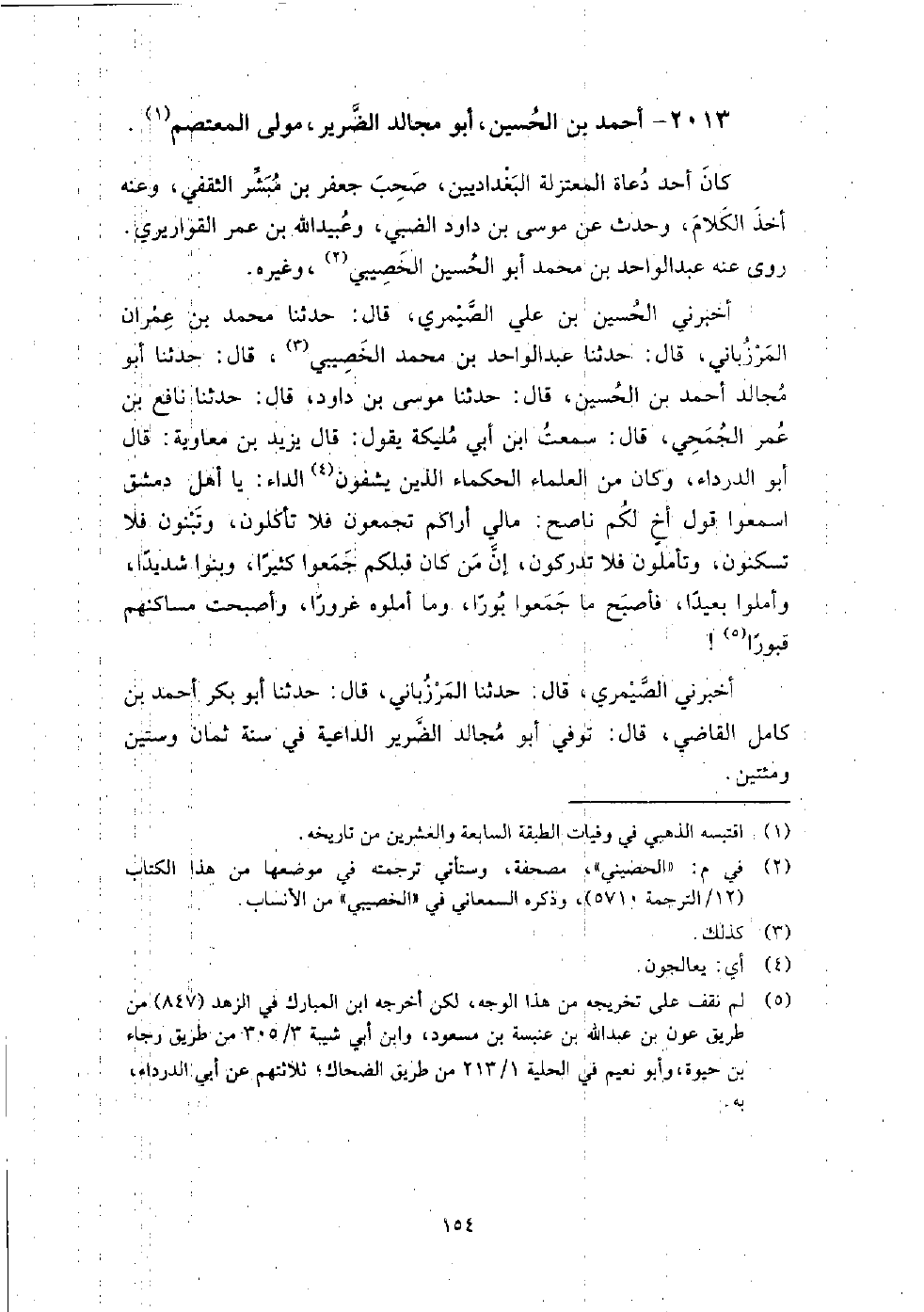 2013 - أَحْمَد بْن الْحُسَيْن أَبُو مجالد الضرير مولى المعتصم كَانَ أحد دعاة المعتزلة البغداديين، صحب جعفر بْن مبشر الثقفي، وعنه أخذ الكلام، وَحَدَّثَ عَنْ: مُوسَى بْن دَاوُد الضبي، وعُبَيْد اللَّهِ بْن عُمَر القواريري، رَوَى عَنْهُ: عَبْد الْوَاحِدِ بْن مُحَمَّد أَبُو الْحُسَيْن الخصيبي، وغيره.