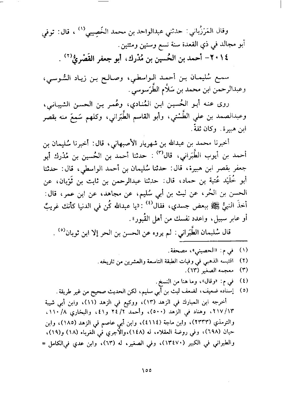 (1328) -[5: 155] أَخْبَرَنَا مُحَمَّدُ بْنُ عَبْدِ اللَّهِ بْنِ شَهْرَيَارَ الأَصْبَهَانِيُّ، قَالَ: أَخْبَرَنَا سُلَيْمَانُ بْنُ أَحْمَدَ بْنِ أَيُّوبَ الطَّبَرَانِيُّ، قَالَ: حَدَّثَنَا أَحْمَدُ بْنُ الْحُسَيْنِ بْنِ مُدْرَكٍ أَبُو جَعْفَرٍ بِقَصْرِ ابْنِ هُبَيْرَةَ، قَالَ: حَدَّثَنَا سُلَيْمَانُ بْنُ أَحْمَدَ الْوَاسِطِيُّ، قَالَ: حَدَّثَنَا أَبُو خُلَيْدٍ عُتْبَةُ بْنُ حَمَّادٍ، قَالَ: حَدَّثَنَا عَبْدُ الرَّحْمَنِ بْنُ ثَابِتِ بْنِ ثَوْبَانَ، عَنِ الْحَسَنِ بْنِ الْحُرِّ، عَنْ لَيْثِ بْنِ أَبِي سُلَيْمٍ، عَنْ مُجَاهِدٍ، عَنِ ابْنِ عُمَرَ، قَالَ: أَخَذَ النَّبِيُّ صَلَّى اللَّهُ عَلَيْهِ وَسَلَّمَ بِبَعْضِ جَسَدِي، فَقَالَ: " يَا عَبْدَ اللَّهِ، كُنْ فِي الدُّنْيَا كَأَنَّكَ غَرِيبٌ أَوْ عَابِرُ سَبِيلٍ، وَاعْدُدْ نَفْسَكَ مِنْ أَهْلِ الْقُبُورِ " قَالَ سُلَيْمَان الطبراني: لم يروه عَنِ الْحَسَن بْن الحر، إلا ابْن ثوبان.