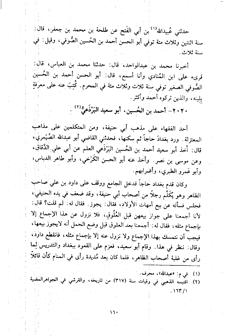 2020 - أَحْمَد بْن الْحُسَيْن أَبُو سَعِيد البرذعي أحد الفقهاء على مذهب أَبِي حنيفة، ومن المتكلمين على مذاهب المعتزله، ورد بغداد حاجا ثم سكنها، فحدثني الْقَاضِي أَبُو عَبْد اللَّه الصيمري، قَالَ: أخذ أَبُو سَعِيد أَحْمَد بْن الْحُسَيْن البرذعي العلم عَنْ أَبِي عَلِيّ الدَّقَّاق، وعن مُوسَى بْن نصر، وأخذ عَنْهُ أَبُو الْحَسَن الكرخي، وَأَبُو طَاهِر الدباس، وَأَبُو عمرو الطبري، وأضرابهم.