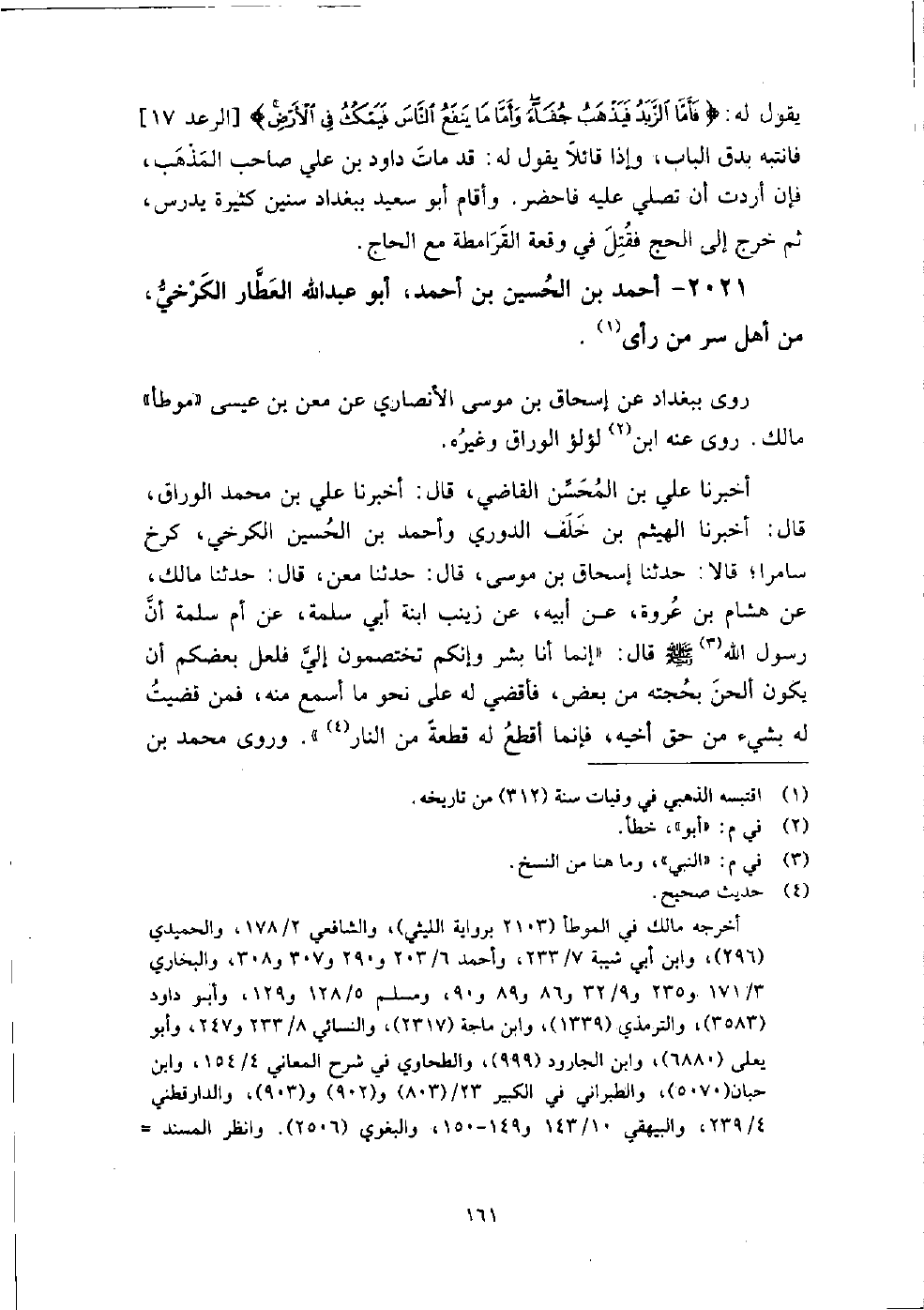 2021 - أَحْمَد بْن الْحُسَيْن بْن أَحْمَدَ أَبُو عَبْد اللَّه الْعَطَّار الكرخي من أهل سر من رأى، روى بِبَغْدَادَ عَنْ إِسْحَاق بْن مُوسَى الأَنْصَارِيّ، عَنْ مَعْنِ بن عِيسَى موطأ مالك، رَوَى عَنْهُ: ابن أَبُو لؤلؤ الوراق وغيره.