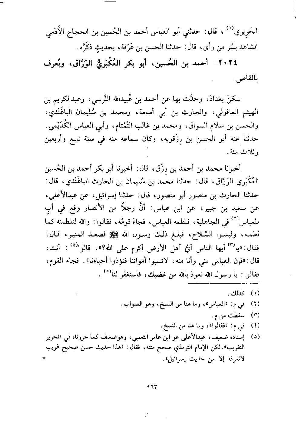 2024 - أَحْمَد بْن الْحُسَيْن أَبُو بَكْر العكبري الوراق ويعرف بالقاص سكن بغداد، وَحَدَّثَ بها عَنْ أَحْمَد بْن عُبَيْد اللَّهِ النرسي، وعبد الكريم بْن الهيثم العاقولي، والحارث بْن أَبِي أسامة، ومحمد بْن سُلَيْمَان الباغندي، والحسن بْن سلام السواق، ومحمد بْن غالب التمتام، وأبي الْعَبَّاس الكديمي، حَدَّثَنَا عَنْهُ أَبُو الْحَسَن بْن رزقويه، وَكَانَ سماعه منه فِي سنة تسع وأربعين وثلاث مائة.