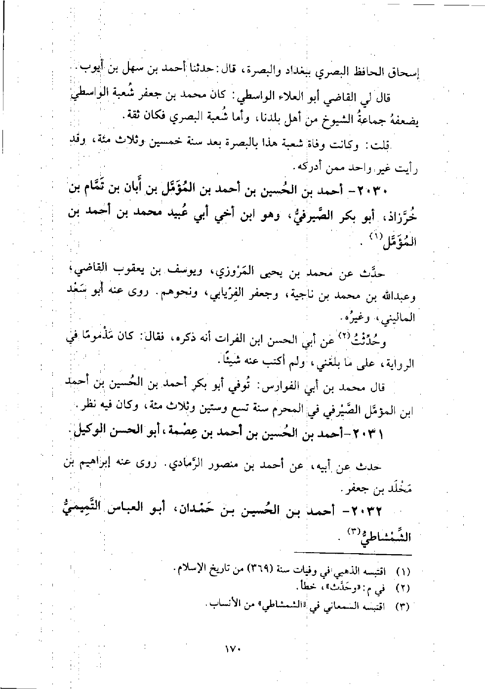 2032 - أَحْمَد بْن الْحُسَيْن بْن حمدان أَبُو الْعَبَّاس التميمي الشمشاطي حدث بِبَغْدَادَ، عَنْ مُحَمَّد بْن عَبْد اللَّه بْن الْحُسَيْن المستعيني، رَوَى عَنْهُ: أَبُو بَكْر أَحْمَد بْن عُمَر ابْن البقال، وَقَالَ: هو شيخ ثقة، قدم عَلَيْنَا من الموصل فِي سنة إحدى وسبعين وثلاث مائة.