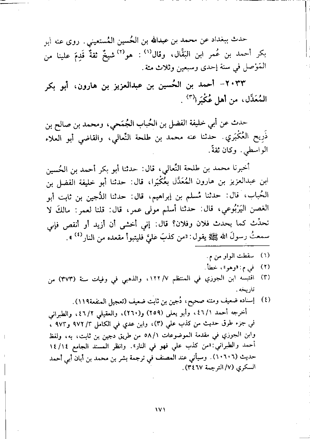 (1336) -[5: 171] أَخْبَرَنَا مُحَمَّدُ بْنُ طَلْحَةَ النِّعَالِيُّ، قَالَ: حَدَّثَنَا أَبُو بَكْرٍ أَحْمَدُ بْنُ الْحُسَيْنِ بْنِ عَبْدِ الْعَزِيزِ بْنِ هَارُونَ الْمُعَدَّلُ بِعُكْبَرَا، قَالَ: حَدَّثَنَا أَبُو خَلِيفَةَ الْفَضْلُ بْنُ الْحُبَابِ، قَالَ: حَدَّثَنَا مُسْلِمُ بْنُ إِبْرَاهِيمَ، قَالَ: حَدَّثَنَا الدَّجِينُ بْنُ ثَابِتٍ أَبُو الْغُصْنِ الْيَرْبُوعِيُّ، قَالَ: حَدَّثَنَا أَسْلَمُ مَوْلَى عُمَرَ، قَالَ: قُلْنَا لِعُمَرَ، مَا لَكَ لا تُحَدِّثُ كَمَا يُحَدِّثُ فُلانٌ وَفُلانٌ، قَالَ: إِنِّي أَخْشَى أَنْ أَزِيدَ أَوْ أَنْقُصَ، فَإِنِّي سَمِعْتُ رَسُولَ اللَّهِ صَلَّى اللَّهُ عَلَيْهِ وَسَلَّمَ يَقُولُ: " مَنْ كَذَبَ عَلِيَّ فَلْيَتَبَوَّأْ مَقْعَدَهُ مِنَ النَّارِ " قَالَ مُحَمَّد بْن أَبِي الفوارس: بلغنا وفاة أَحْمَد بْن عَبْد العزيز العكبري، بعكبرا لسبع خلون من رجب سنة ثلاث وسبعين وثلاث مائة.