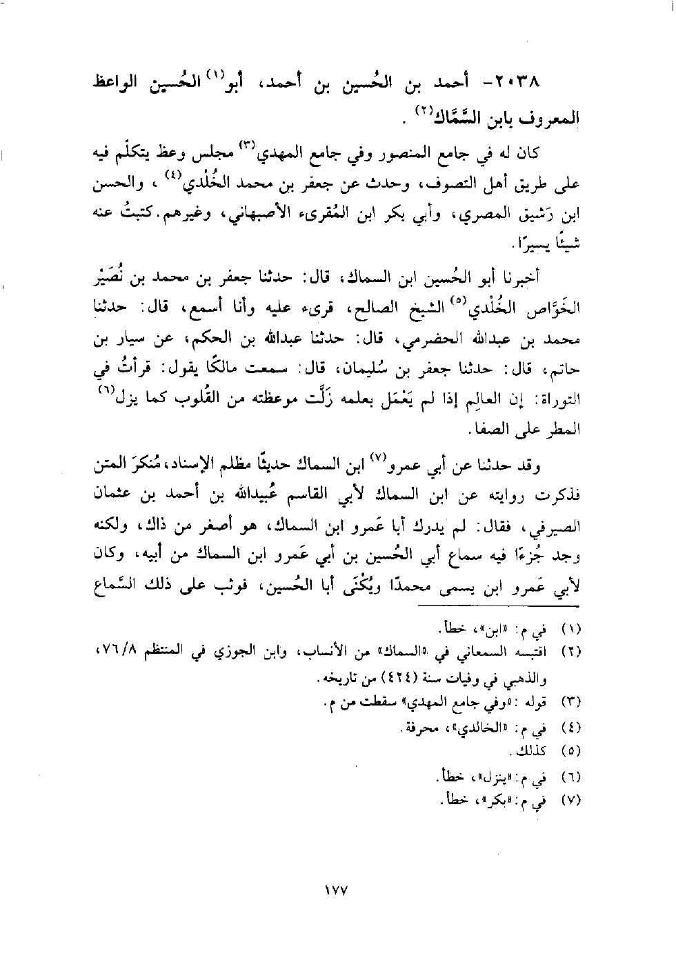 2038 - أَحْمَد بْن الْحُسَيْن بْن أَحْمَدَ أَبُو الْحُسَيْن الْوَاعِظ الْمَعْرُوف بابن السَّمَّاك كَانَ لَهُ فِي جامع المنصور وَفِي جامع المهدي مجلس وعظ يتكلم فيه على طريقة أهل التصوف، وَحَدَّثَ عَنْ: جعفر بْن مُحَمَّد الخُلْدي، والحسن بْن رشيق المصري، وأبي بَكْر ابْن الْمُقْرِي الأصبهاني، وغيرهم، كتبت عَنْهُ شيئا يسيرا.