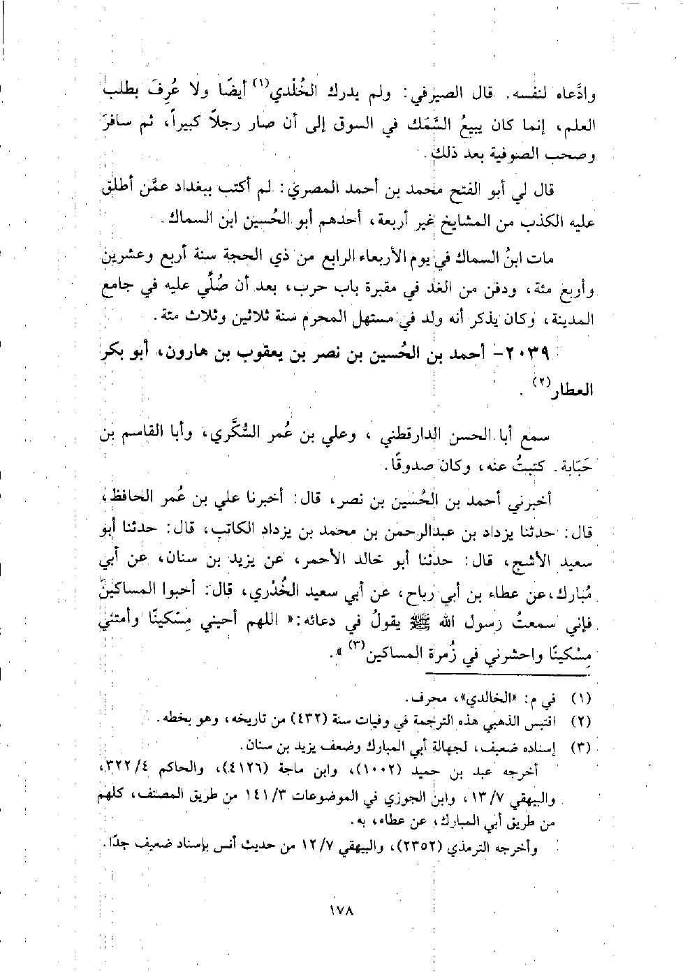 (1339) -[5: 178] أَخْبَرَنِي أَحْمَدُ بْنُ الْحُسَيْنِ بْنِ نَصْرٍ، قَالَ: أَخْبَرَنَا عَلِيُّ بْنُ عُمَرَ الْحَافِظُ، قَالَ: حَدَّثَنَا يَزْدَاذُ بْنُ عَبْدِ الرَّحْمَنِ بْنِ مُحَمَّدِ بْنِ يَزْدَاذَ الْكَاتِبُ، قَالَ: حَدَّثَنَا أَبُو سَعِيدٍ الأَشَجُّ، قَالَ: حَدَّثَنَا أَبُو خَالِدٍ الأَحْمَرُ، عَنْ يَزِيدَ بْنِ سِنَانٍ، عَنْ أَبِي مُبَارَكٍ، عَنْ عَطَاءَ بْنِ أَبِي رَبَاحٍ، عَنْ أَبِي سَعِيدٍ الْخُدْرِيِّ، قَالَ: أَحِبُّوا الْمَسَاكِينَ، فَإِنِّي سَمِعْتُ رَسُولَ اللَّهِ صَلَّى اللَّهُ عَلَيْهِ وَسَلَّمَ يَقُولُ فِي دُعَائِهِ: " اللَّهُمَّ أَحْيِنِي مِسْكِينًا وَأَمِتْنِي مِسْكِينًا وَاحْشُرْنِي فِي زُمْرَةِ الْمَسَاكِينِ " سألت ابْن نصر عَنْ مولده، فَقَالَ: فِي شوال سنة ثمان وسبعين وثلاث مائة، ومات فِي يوم الأربعاء الحادي عشر من ذي الحجة سنة اثنتين وثلاثين وأربع مائة، ودفن من الغد فِي مقبرة جامع المدينة.