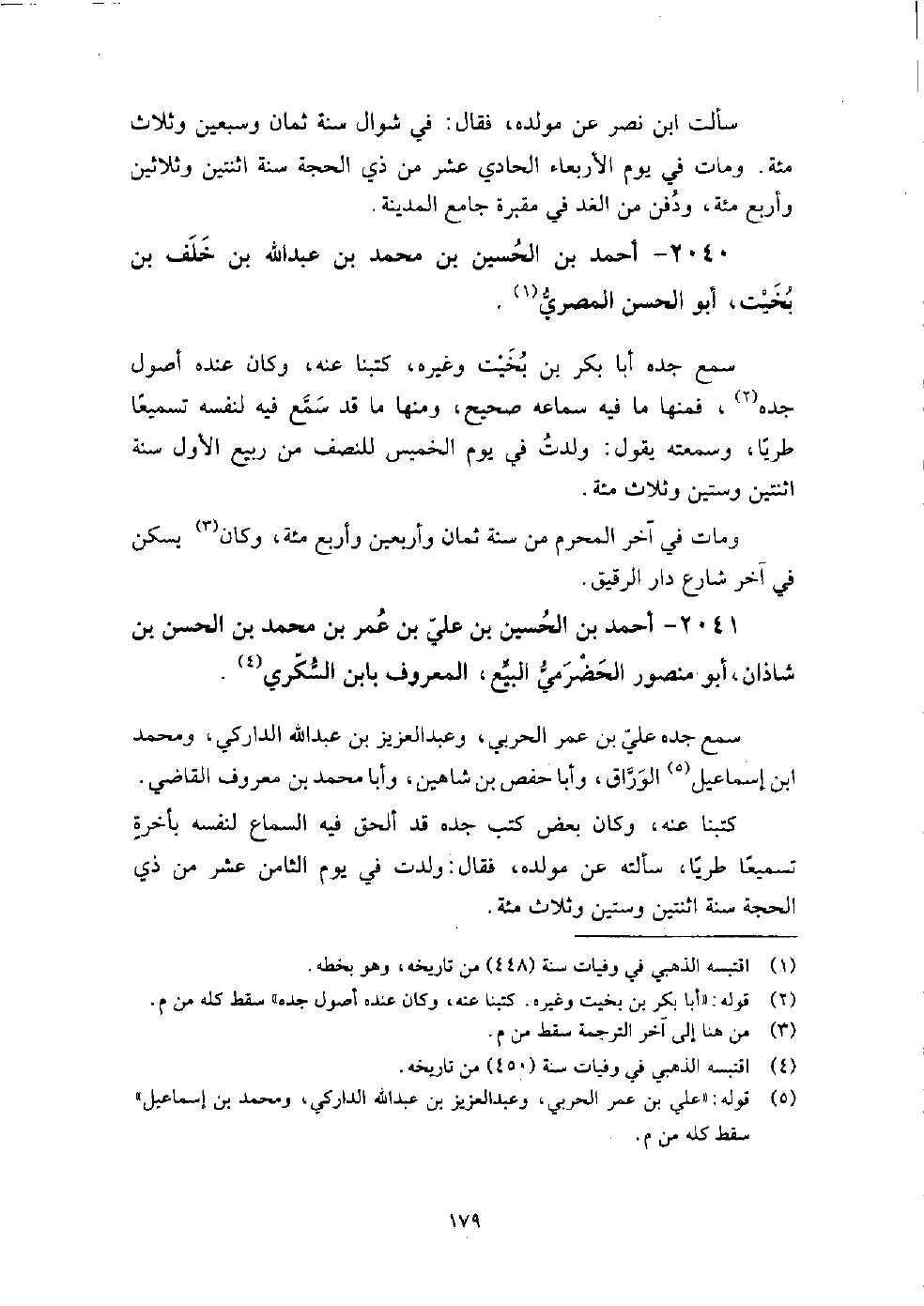 2040 - أَحْمَد بْن الْحُسَيْن بْن مُحَمَّد بْن عَبْد اللَّه بْن خَلَفِ بْنِ بخيت أَبُو الْحَسَن المصري سمع جَدِّهِ أَبَا بَكْر بْن بخيت، وغيره كتبنا عَنْهُ، وَكَانَ عنده أصول جَدِّهِ، فمنها ما فيه سماعه صحيح، ومنها ما قد سمع فيه لنفسه تسميعا طريا، وسمعته يَقُولُ: ولدت فِي يوم الخميس للنصف من ربيع الأول سنة اثنتين وستين وثلاث مائة.