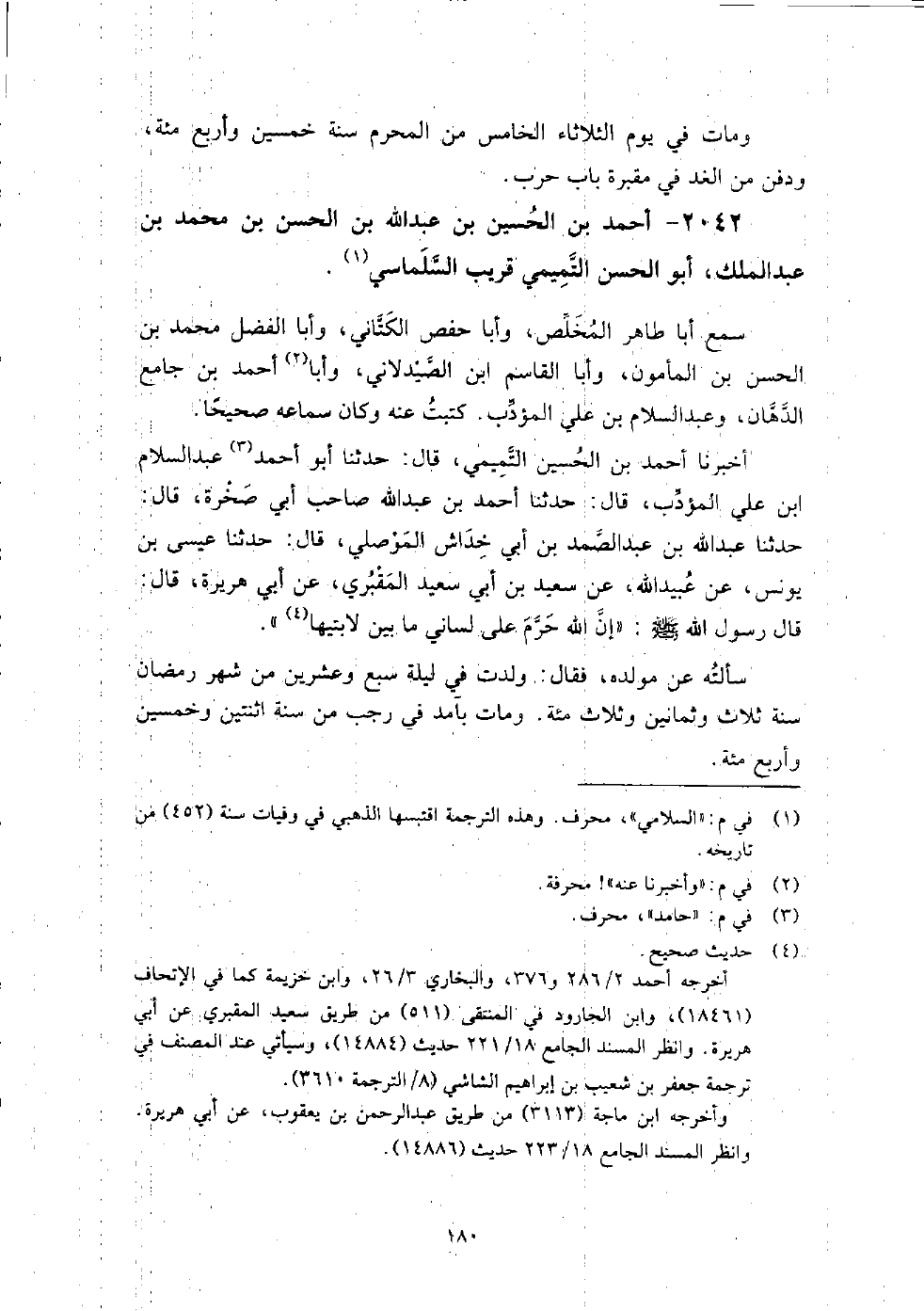 (1340) -[5: 180] أَخْبَرَنَا أَحْمَدُ بْنُ الْحُسَيْنِ التَّمِيمِيُّ، قَالَ: حَدَّثَنَا أَبُو أَحْمَدَ عَبْدُ السَّلامِ بْنُ عَلِيٍّ الْمُؤَدِّبُ، قَالَ: حَدَّثَنَا أَحْمَدُ بْنُ عَبْدِ اللَّهِ صَاحِبِ أَبِي صَخْرَةَ، قَالَ: حَدَّثَنَا عَبْدُ اللَّهِ بْنُ عَبْدِ الصَّمَدِ بْنِ أَبِي خِدَاشٍ الْمَوْصِلِيُّ، قَالَ: حَدَّثَنَا عِيسَى بْنُ يُونُسَ، عَنْ عُبَيْدِ اللَّهِ، عَنْ سَعِيدِ بْنِ أَبِي سَعِيدٍ الْمَقْبُرِيُّ، عَنْ أَبِي هُرَيْرَةَ، قَالَ: قَالَ رَسُولُ اللَّهِ صَلَّى اللَّهُ عَلَيْهِ وَسَلَّمَ: " إِنَّ اللَّهَ حَرَّمَ عَلَى لِسَانِي مَا بَيْنَ لابَتَيْهَا " سألته عَنْ مولده، فَقَالَ: ولدت فِي ليلة سبع وعشرين من شهر رمضان سنة ثلاث وثمانين وثلاث مائة، ومات بآمد فِي رجب من سنة اثنتين وخمسين وأربع مائة.