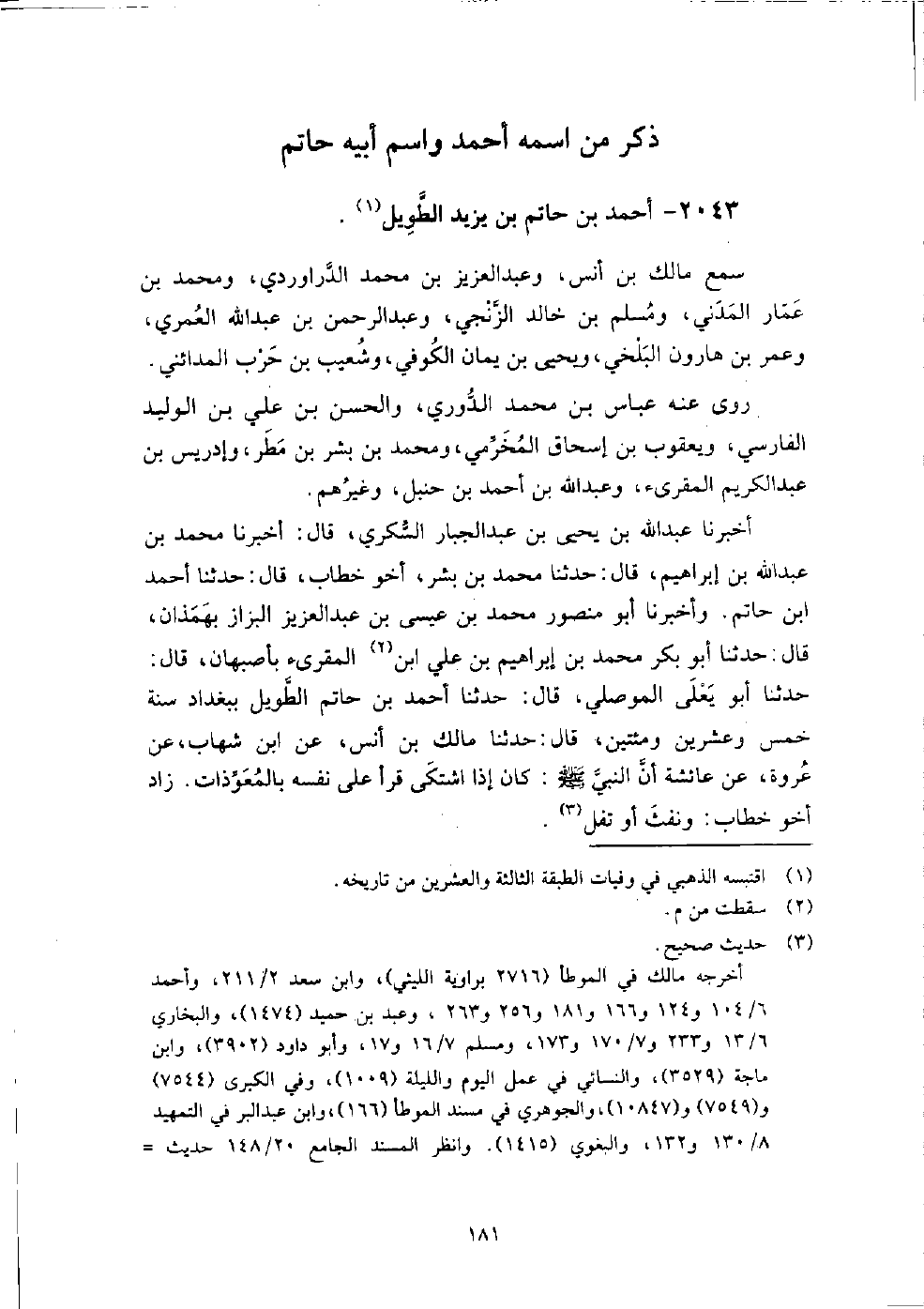 2043 - أَحْمَد بْن حاتم بْن يَزِيد الطويل سمع مالك بْن أنس، وعبد العزيز بْن مُحَمَّد الدراوردي، ومحمد بْن عمار المدني، ومسلم بْن خَالِد الزنجي، وعبد الرَّحْمَن بْن عَبْد اللَّه العمرى، وعمر بْن هارون البلخي، ويحيى بْن يمان الْكُوفِيّ، وشعيب بْن حرب المدائني.