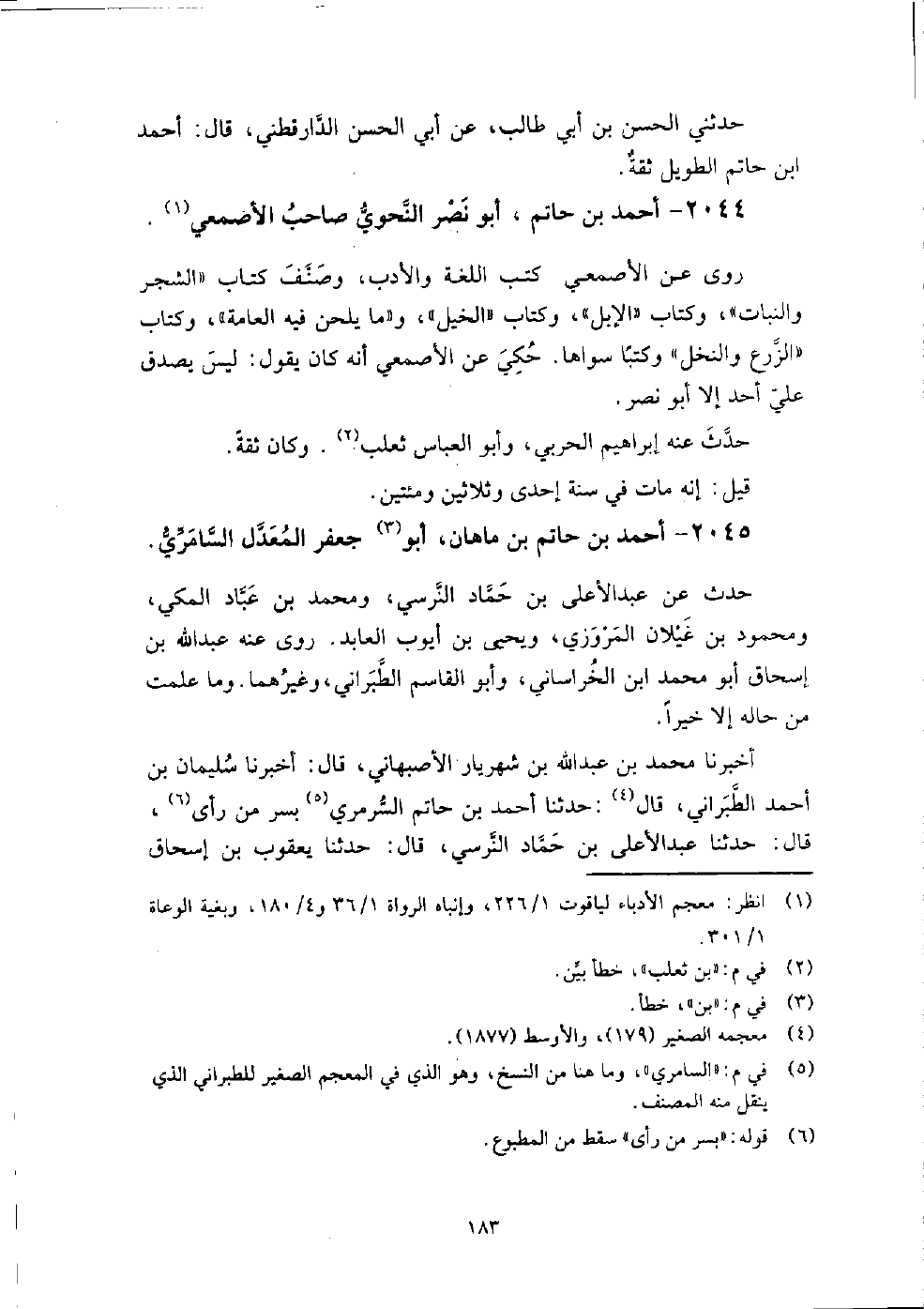 2044 - أَحْمَد بْن حاتم أَبُو نصر النحوي صاحب الأصمعي روى عَنِ الأصمعي كتب اللغة والأدب، وصنف كتاب الشجر والنبات، وكتاب الإبل، وكتاب الخيل، وما يلحن فيه العامة، وكتاب الزرع والنخل، وكتبا سواها، حكى عَنِ الأصمعي أنه كَانَ يَقُولُ: ليس يصدق عَلِيّ أحد إلا أَبُو نصر.