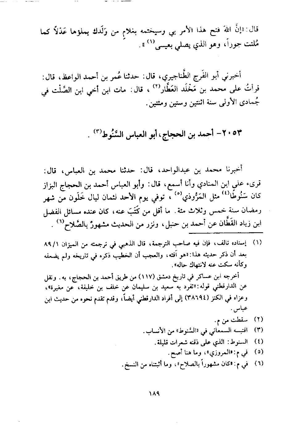 2053 - أَحْمَد بْن الحجاج أَبُو الْعَبَّاس السنوط أَخْبَرَنَا مُحَمَّد بْن عَبْد الْوَاحِدِ، قَالَ: حَدَّثَنَا مُحَمَّد بْن الْعَبَّاس، قَالَ: قرئ على ابْن المنادي وأنا أسمع، قَالَ: وَأَبُو الْعَبَّاس أَحْمَد بْن الحجاج البزار كَانَ سنوطا مثل المروذي، توفي يوم الأحد لثمان ليال خلون من شهر رمضان سنة خمس وثلاث مائة، ما أقل من كتب عَنْهُ كَانَ عنده مسائل الْفَضْل بْن زياد القطان، عَنْ أَحْمَد بْن حنبل، ونزر من الحديث مشهورٌ بالصلاح.