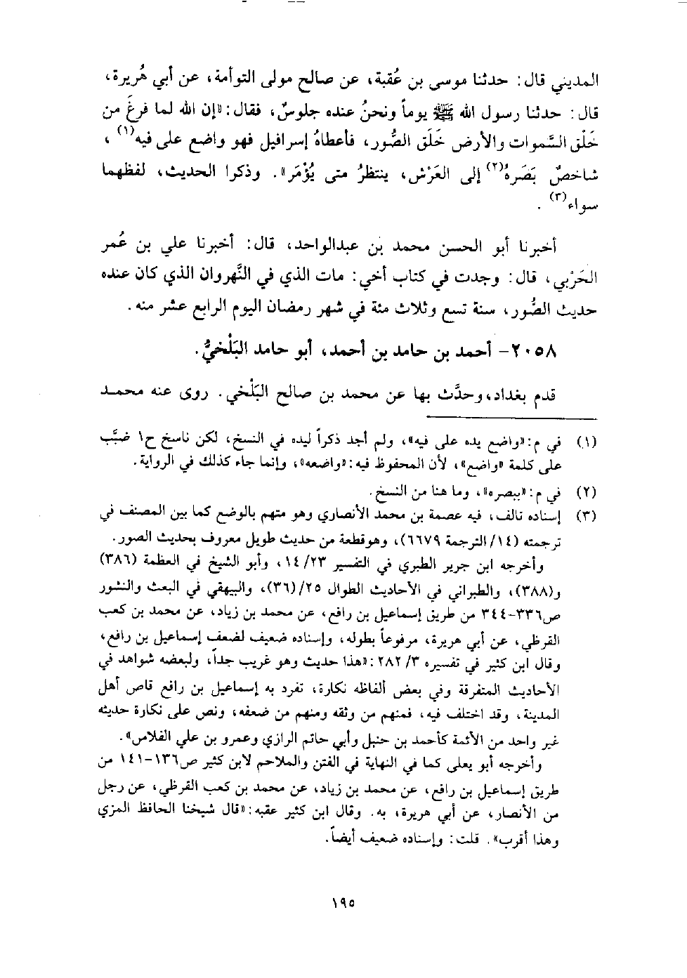 2058 - أَحْمَد بْن حامد بْن أَحْمَدَ أَبُو حامد البلخي قدم بغداد، وَحَدَّثَ بها عَنْ مُحَمَّد بْن صالح البلخي، رَوَى عَنْهُ: مُحَمَّد ابْن إِسْحَاق القطيعي.
