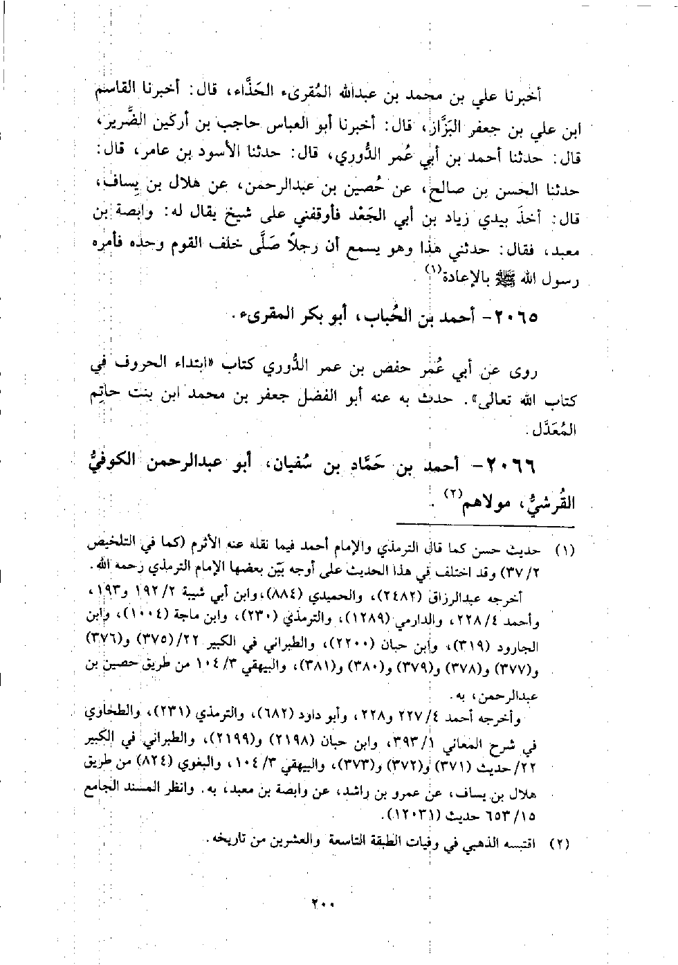 2066 - أَحْمَد بْن حَمَّاد بْن سُفْيَان أَبُو عَبْد الرَّحْمَن الْكُوفِيّ الْقُرَشِيّ مولاهم سمع أَبَا بلال الأشعري، وهارون بْن سَعِيد الأيلي، وَعَبْد اللَّهِ بْن معاوية الجمحي، وعقبة بْن مكرم، وَأَبَا كريب الهمداني، ويوسف بْن مُوسَى القطان، ونحوهم، وقدم بغداد، وَحَدَّثَ بها، فرَوَى عَنْهُ: أَبُو عمرو ابْن السماك، وعبد الباقي بْن قانع، وجعفر بْن مُحَمَّد ابْن بنت حاتم بْن ميمون، ومحمد بْن عَلِيّ بْن حبيش، وَكَانَ ثِقَةً، ولي قضاء المصيصة.