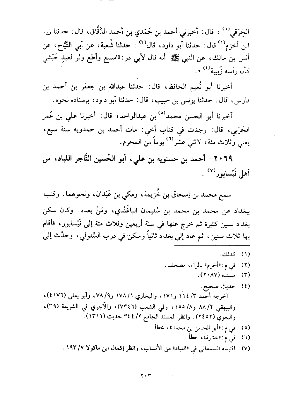2069 - أَحْمَد بْن حَسْنَوَيْهِ بْن عَلِيّ أَبُو الْحُسَيْن التاجر اللباد من أهل نيسابور، سمع مُحَمَّد بْن إِسْحَاق بْن خزيمة، ومكي بْن عبدان، ونحوهما، وكتب بِبَغْدَادَ عَنْ مُحَمَّد بْن مُحَمَّد بْن سُلَيْمَان الباغندي، ومن بعده، وَكَانَ سكن بغداد سنين كثيرة ثم خرج عنها فِي سنة أربعين وثلاث مائة إِلَى نيسابور، فأقام بها ثلاث سنين، ثم عاد إِلَى بغداد ثانيا وسكن فِي درب السلولي، وَحَدَّثَ إلي حين وفاته، حَدَّثَنَا عَنْهُ أَبُو بَكْر البرقاني.