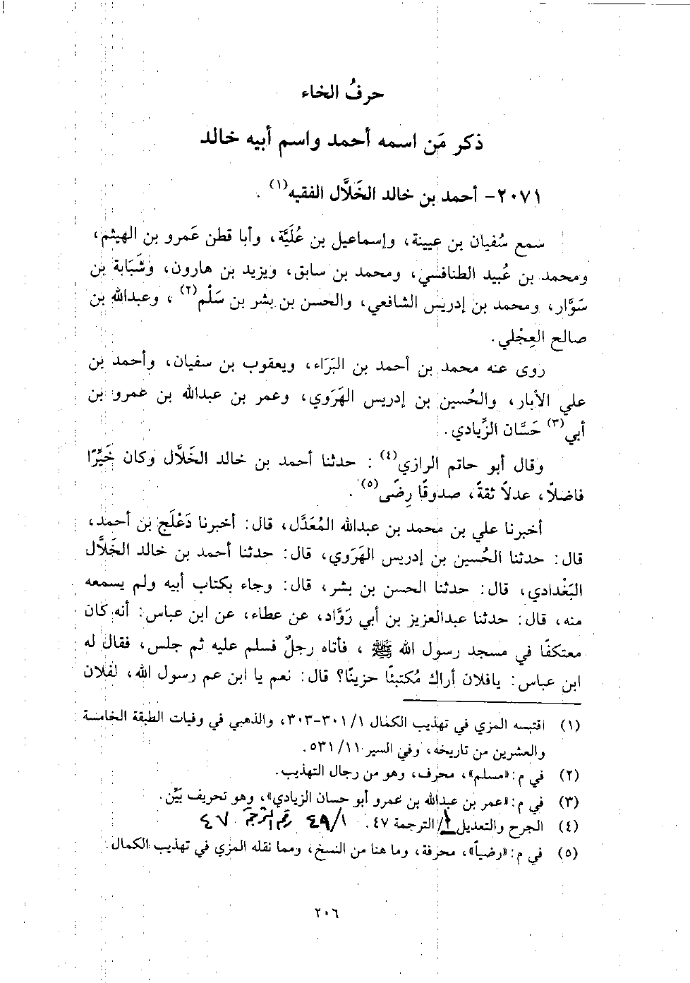 2071 - أَحْمَد بْن خَالِد الخلال الْفَقِيه سمع سُفْيَان بْن عُيَيْنَةَ، وإسماعيل ابْن علية، وَأَبَا قطن عمرو بْن الهيثم، ومحمد بْن عبيد الطنافسي، ومحمد بْن سابق، ويزيد بْن هارون، وشبابة بْن سوار، ومحمد بْن إِدْرِيس الشَّافِعِيّ، والحسن بْن بشر بْن سلم، وَعَبْد اللَّهِ بْن صالح العجلي.
