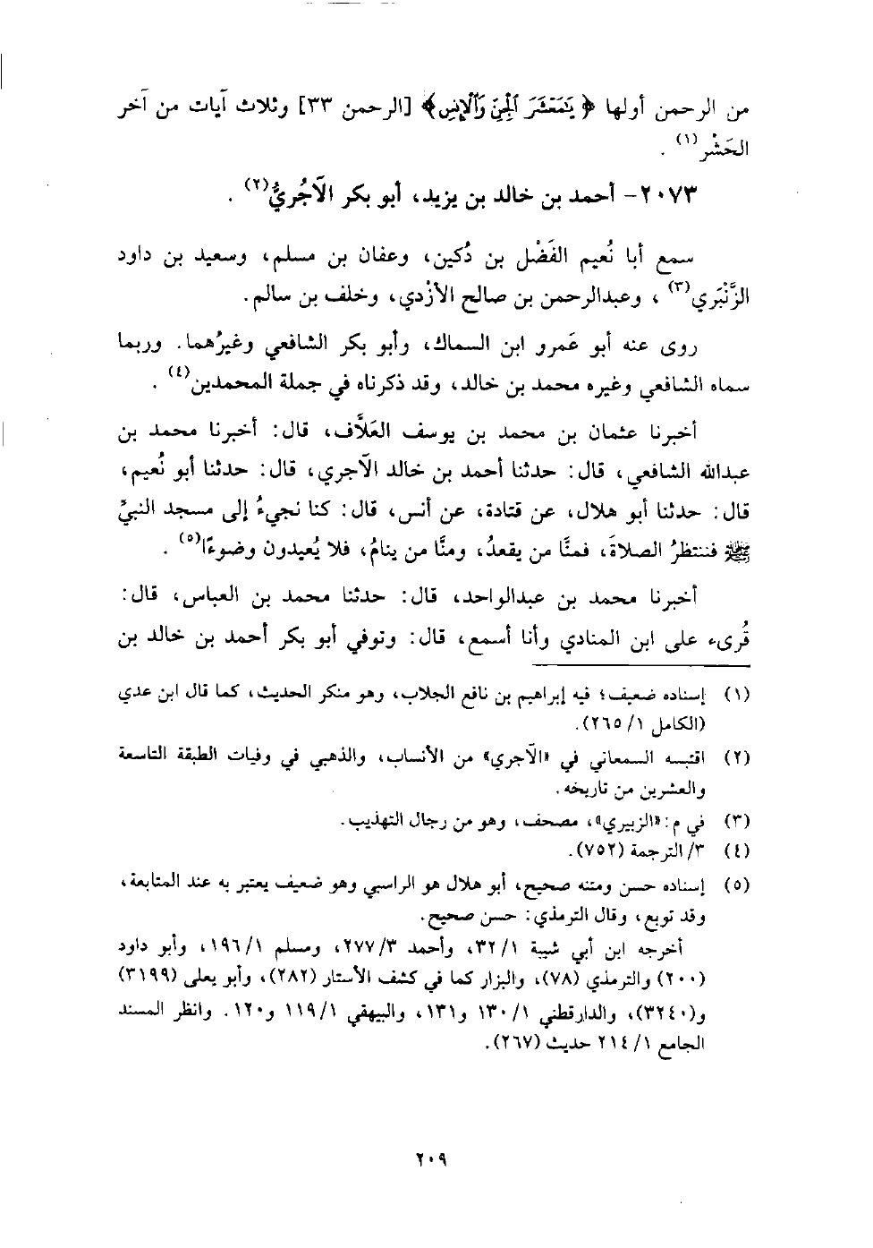2073 - أَحْمَد بْن خَالِد يَزِيد أَبُو بَكْر الآجري سمع أَبَا نعيم الْفَضْل بْن دكين، وعفان بْن مُسْلِم، وسعيد بْن دَاوُد الزَّنْبَري، وعبد الرَّحْمَن بْن صالح الأزدي، وخلف بْن سالم.