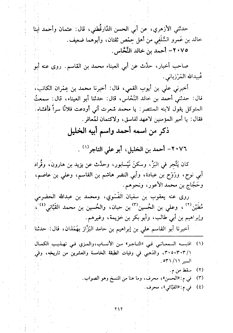 2076 - أَحْمَد بْن الخليل أَبُو عَلِيٍّ التاجر كَانَ يتجر فِي البز، وسكن نيسابور، وَحَدَّثَ عَنْ: يَزِيد بْن هارون، وقراد أَبِي نوح، وروح بْن عبادة، وأبي النضر هاشم بْن الْقَاسِم، وعلي بْن عَاصِم، وحجاج بْن مُحَمَّد الأعور، ونحوهم.