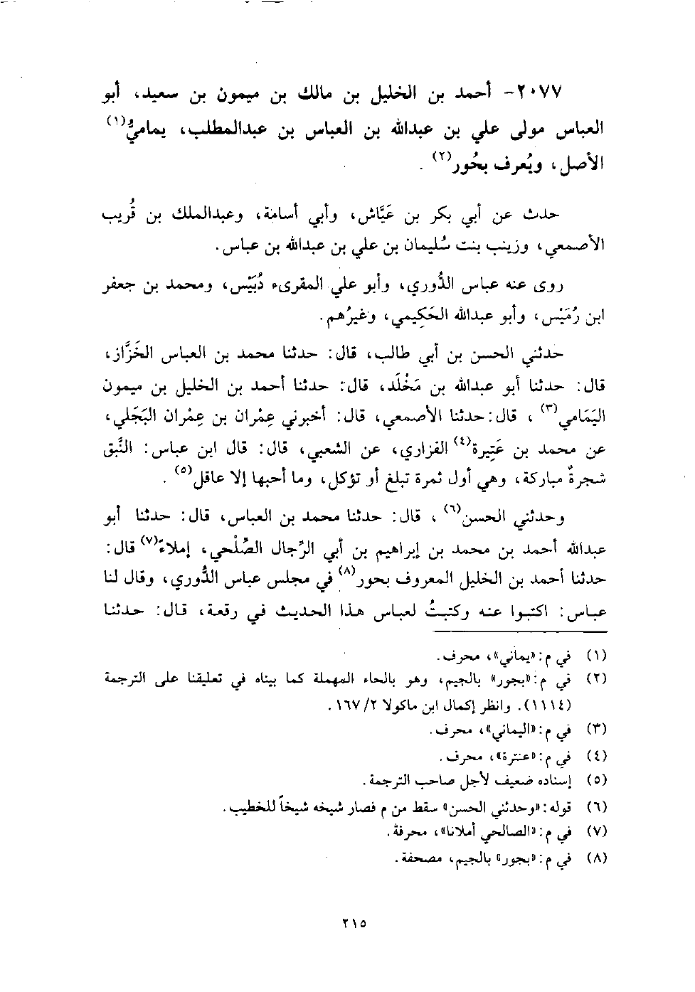 2077 - أَحْمَد بْن الخليل بْن مالك بْن ميمون بْن سَعِيد أَبُو الْعَبَّاس مولى عَلِيّ بْن عَبْد اللَّه بْن الْعَبَّاس بْن عَبْد المطلب يمامي الأصل ويعرف بحور حدث عَنْ: أَبِي بَكْر بْن عياش، وأبي أسامة، وعبد الملك بْن قريب الأصمعي، وزينب بنت سُلَيْمَان بْن عَلِيّ بْن عَبْد اللَّه بْن عباس.