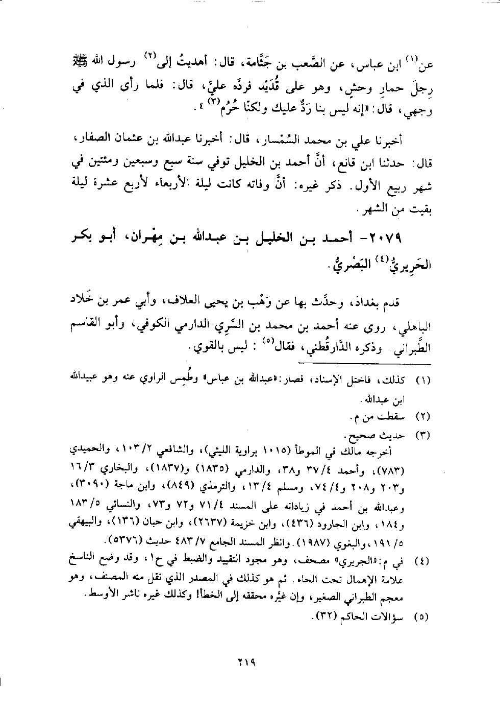 2079 - أَحْمَد بْن الخليل بْن عَبْد اللَّه بْن مهران أَبُو بَكْر الحريري البصري قدم بغداد، وَحَدَّثَ بها عَنْ وهب بْن يَحْيَى العلاف، وأبي عُمَر بْن خلاد الباهلي، رَوَى عَنْهُ: أَحْمَد بْن مُحَمَّد بْن السري الدارمي الْكُوفِيّ، وَأَبُو الْقَاسِم الطبراني، وذكره الداراقطني، فَقَالَ: ليس بالقوي.