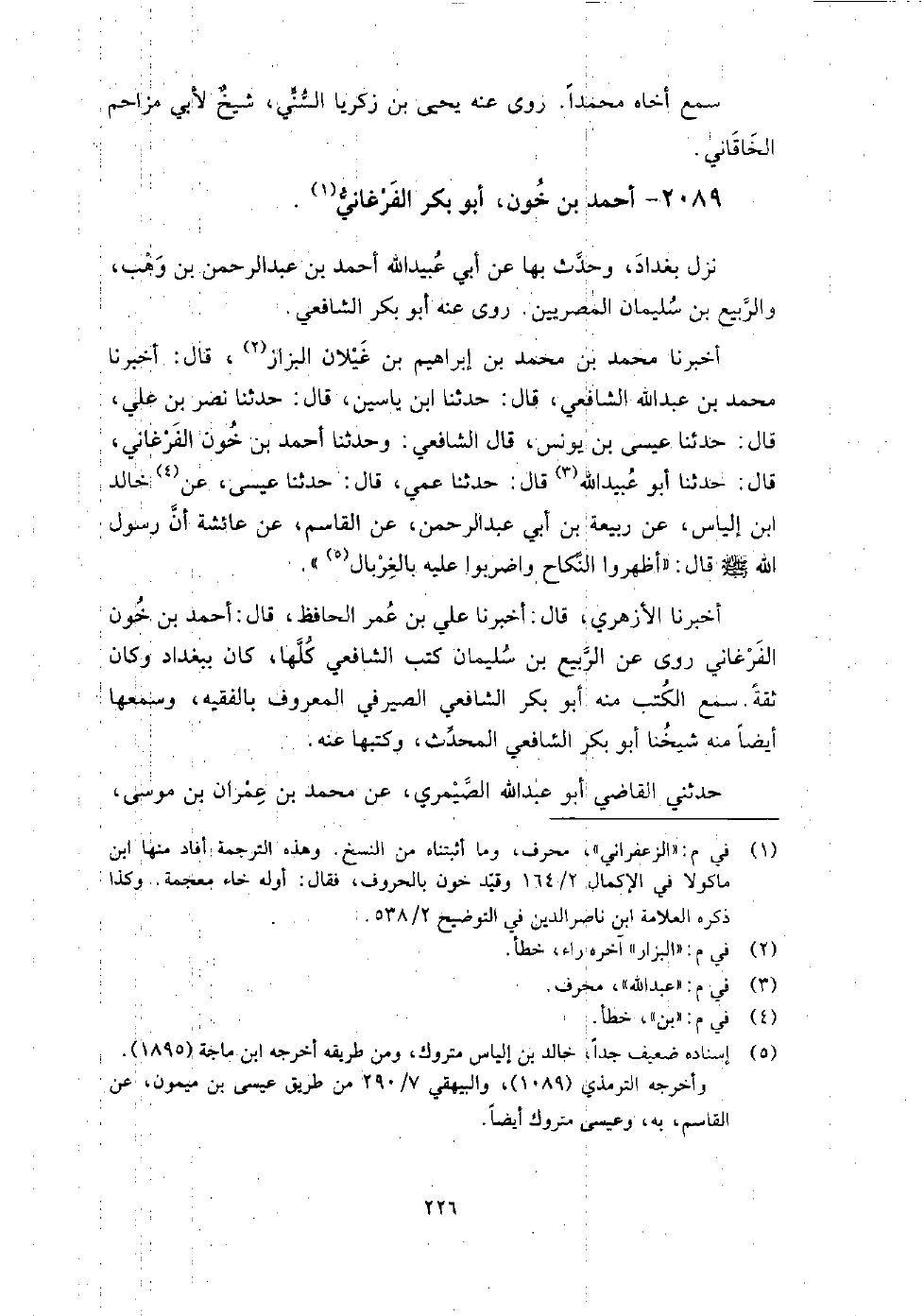 2089 - أَحْمَد بْن خون أَبُو بَكْر الفَرْغانيُّ نزل بغداد، وَحَدَّثَ بها عَنْ أَبِي عُبَيْد اللَّهِ أَحْمَد بْن عَبْد الرَّحْمَن بْن وهب، والربيع بْن سُلَيْمَان المصريين، رَوَى عَنْهُ: أَبُو بَكْر الشَّافِعِيّ.