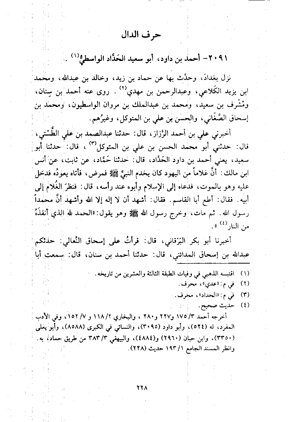 (1377) -[5: 228] أَخْبَرَنِي عَلِيُّ بْنُ أَحْمَدَ الرَّزَّازُ، قَالَ: حَدَّثَنَا عَبْدُ الصَّمَدِ بْنُ عَلِيٍّ الطَّسْتِيُّ، قَالَ: حَدَّثَنِي أَبُو مُحَمَّدٍ الْحَسَنُ بْنُ عَلِيِّ بْنِ الْمُتَوَكِّلِ، قَالَ: حَدَّثَنَا أَبُو سَعِيدٍ يَعْنِي أَحْمَدَ بْنَ دَاوُدَ الْحَدَّادَ، قَالَ: حَدَّثَنَا حَمَّادٌ، عَنْ ثَابِتٍ، عَنْ أَنَسِ بْنِ مَالِكٍ: أَنَّ غُلامًا مِنَ الْيَهُودِ كَانَ يَخْدُمُ النَّبِيَّ صَلَّى اللَّهُ عَلَيْهِ وَسَلَّمَ فَمَرِضَ فَأَتَاهُ يَعُودُهُ فَدَخَلَ عَلَيْهِ وَهُوَ بِالْمَوْتِ، فَدَعَاهُ إِلَى الإِسْلامِ وَأَبُوهُ عِنْدَ رَأْسِهِ، قَالَ: فَنَظَرَ الْغُلامُ إِلَى أَبِيهِ، فَقَالَ: أَطِعْ أَبَا الْقَاسِمِ، فَقَالَ: أَشْهَدُ أَنْ لا إِلَهَ إِلا اللَّهُ وَأَشْهَدُ أَنَّ مُحَمَّدًا رَسُولُ اللَّهِ، ثُمَّ مَاتَ، وَخَرَجَ رَسُولُ اللَّهِ صَلَّى اللَّهُ عَلَيْهِ وَسَلَّمَ وَهُوَ يَقُولُ: " الْحَمْدُ لِلَّهِ الَّذِي أَنْقَذَهُ مِنَ النَّارِ " أَخْبَرَنَا أَبُو بَكْر البرقاني، قَالَ: قرأت على إِسْحَاق النعالي، حدثكم عَبْد اللَّه بْن إِسْحَاق المدائني، قَالَ: حَدَّثَنَا أَحْمَد بْن سنان، قَالَ: سَمِعْتُ أَبَا سَعِيد الحداد، يَقُولُ: استفهمت عَبْد الرَّحْمَن بْن مَهْدِيّ يوما، فَقَالَ لي: كم تستفهم؟ فقلت لَهُ: إن لكل شيء رجحان، ورجحان الحديث الاستفهام، فضحك عَبْد الرَّحْمَن، أو كَمَا قَالَ.
