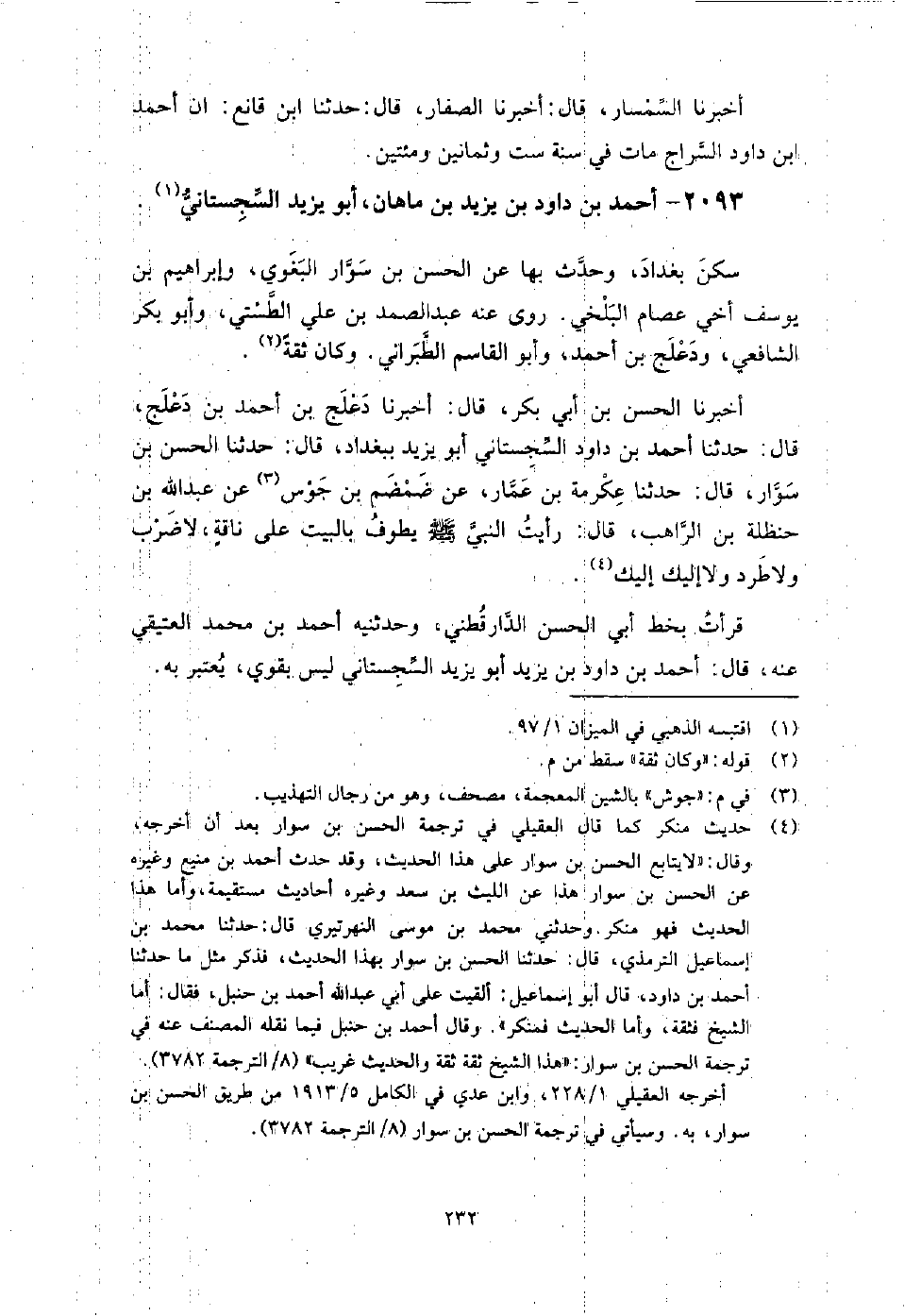 2093 - أَحْمَد بْن دَاوُد بْن يَزِيد بْن ماهان أَبُو يَزِيد السجستاني سكن بغداد، وَحَدَّثَ بها عَنِ الْحَسَن بْن سوار البغوي، وإبراهيم بْن يوسف أخي عصام البلخي، رَوَى عَنْهُ: عَبْد الصمد بْن عَلِيّ الطستي، وَأَبُو بَكْر الشَّافِعِيّ، ودعلج بْن أَحْمَدَ، وَأَبُو الْقَاسِم الطبراني.