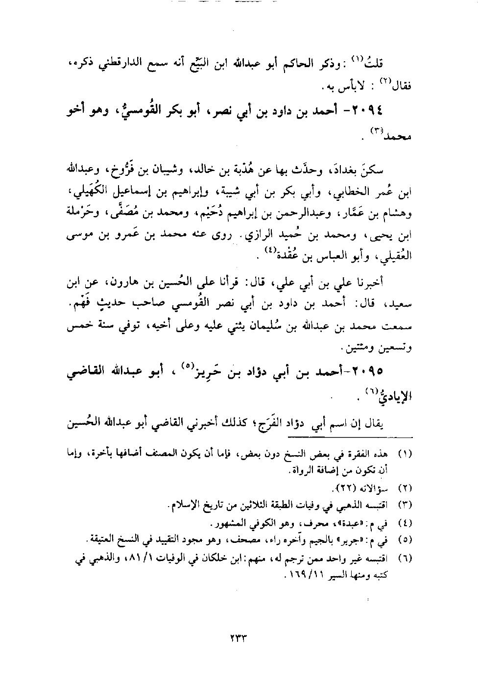 2094 - أَحْمَد بْن دَاوُد بْن أَبِي نصر أَبُو بَكْر القومسي وهو أخو مُحَمَّد سكن بغداد، وَحَدَّثَ بها عَنْ هدبة بْن خَالِد وشيبان بْن فروخ، وَعَبْد اللَّهِ بْن عُمَر الخطابي، وأبي بَكْر بْن أَبِي شيبه، وإبراهيم بْن إِسْمَاعِيل الكهيلي، وهشام بْن عمار، وعبد الرَّحْمَن بْن إِبْرَاهِيم دحيم، ومحمد بْن مصفى، وحرملة بْن يَحْيَى، ومحمد بْن حميد الرَّازِيّ، رَوَى عَنْهُ: مُحَمَّد بْن عمرو بْن مُوسَى العقيلي، وَأَبُو الْعَبَّاس بْن عقدة.