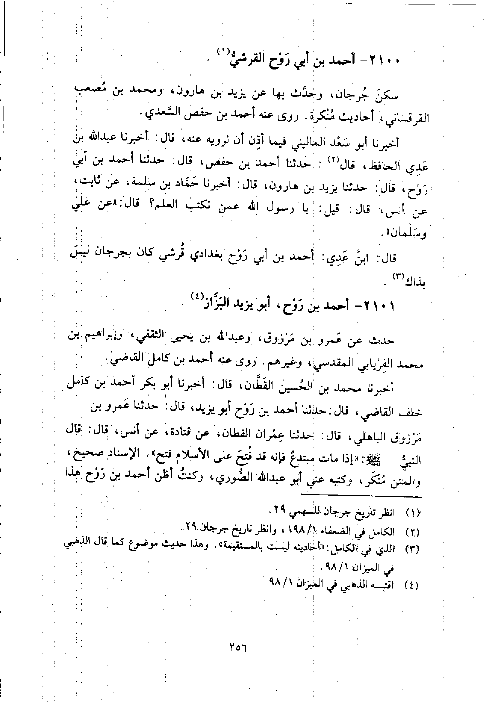 2100 - أَحْمَد بْن أَبِي روح الْقُرَشِيّ سكن جرجان، وَحَدَّثَ بها عَنْ يَزِيد بْن هارون، ومحمد بْن مصعب القرقساني أحاديث منكرة، رَوَى عَنْهُ: أَحْمَد بْن حَفْص السعدي.