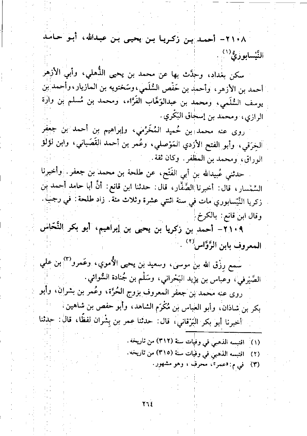 2108 - أَحْمَد بْن زكريا بْن يَحْيَى بْن عَبْد اللَّه أَبُو حامد النَّيْسَابُورِيّ سكن بغداد، وَحَدَّثَ بها عَنْ مُحَمَّد بْن يَحْيَى الذهلي، وأبي الأزهر أَحْمَد بْن الأزهر، وأحمد بْن حَفْص السلمي، وسختويه بْن المازيار، وأحمد بْن يوسف السلمي، ومحمد بْن عَبْد الْوَهَّاب الفراء، ومحمد بْن مُسْلِم بْن وارة الرَّازِيّ، ومحمد بْن إِسْحَاق البكري.
