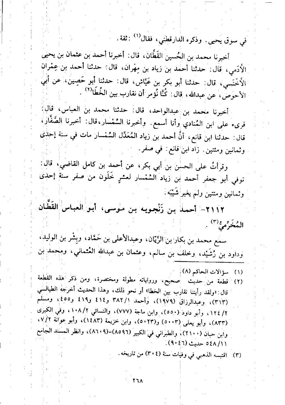 2112 - أَحْمَد بْن زنجويه بْن مُوسَى أَبُو الْعَبَّاس القطان المخرمي سمع مُحَمَّد بْن بكار بْن الريان، وعبد الأعلى بْن حَمَّاد، وبشر بْن الوليد، وداود بْن رشيد، وخلف بْن سالم، وعثمان بْن عَبْد اللَّه العثماني، ومحمد بْن أبي السري العسقلاني.