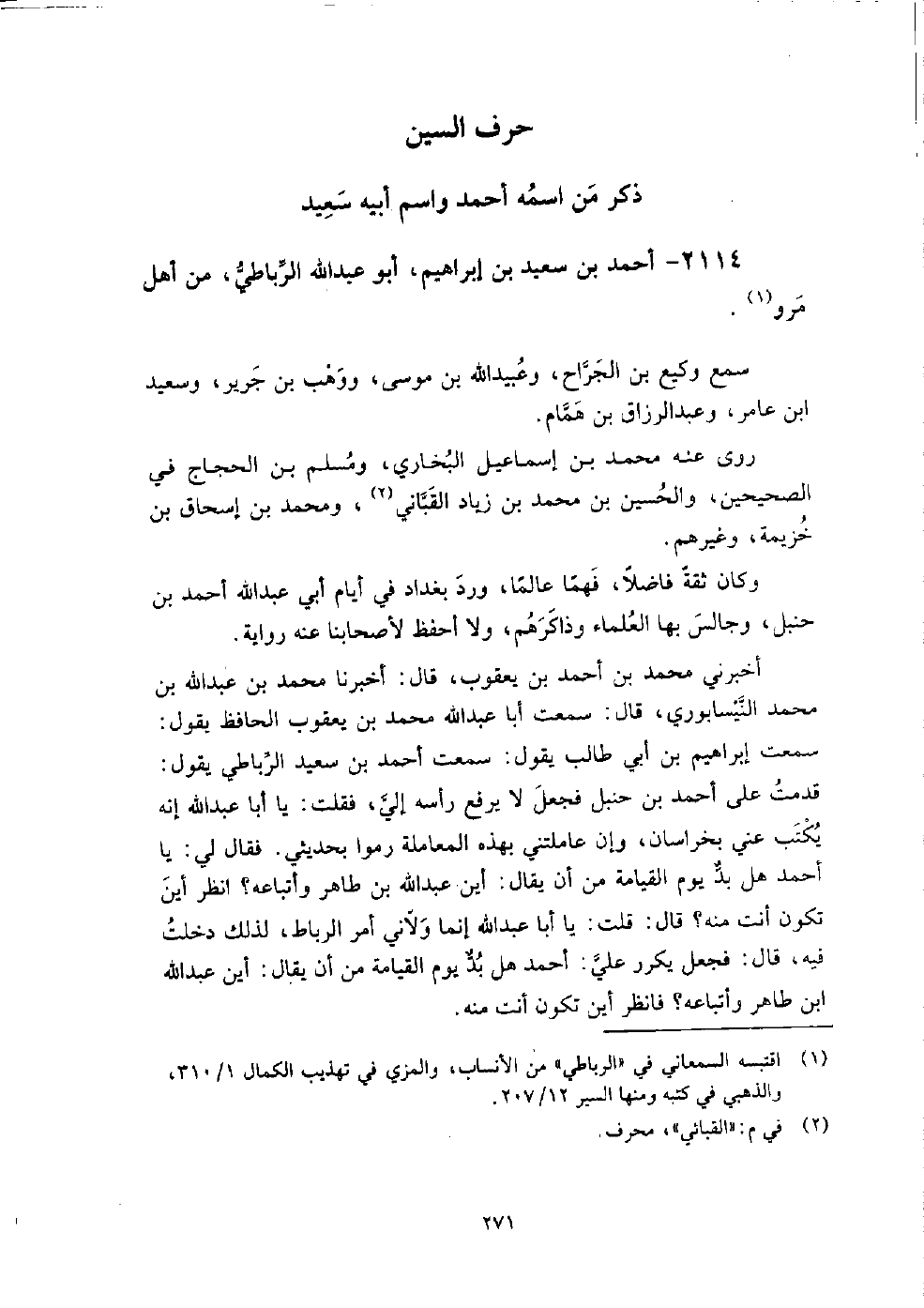 2114 - أَحْمَد بْن سَعِيد بْن إِبْرَاهِيم أَبُو عَبْد اللَّه الرباطي من أهل مرو، سمع وكيع بْن الجراح، وعُبَيْد اللَّهِ بْن مُوسَى، ووهب بْن جرير، وسعيد بْن عامر، وعبد الرزاق بْن همام.