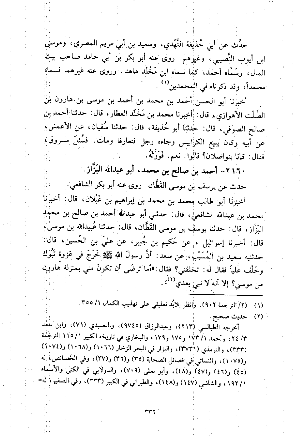 (1426) -[5: 332] أَخْبَرَنَا أَبُو طَالِبٍ مُحَمَّدُ بْنُ مُحَمَّدِ بْنِ إِبْرَاهِيمَ بْنِ غَيْلانَ، قَالَ: أَخْبَرَنَا مُحَمَّدُ بْنُ عَبْدِ اللَّهِ الشَّافِعِيُّ، قَالَ: حَدَّثَنِي أَبُو عَبْدِ اللَّهِ أَحْمَدُ بْنُ صَالِحِ بْنِ مُحَمَّدٍ الْبَزَّازُ، قَالَ: حَدَّثَنَا يُوسُفُ بْنُ مُوسَى الْقَطَّانُ، قَالَ: حَدَّثَنَا عُبَيْدُ اللَّهِ بْنُ مُوسَى، قَالَ: أَخْبَرَنَا إِسْرَائِيلُ، عَنْ حَكِيمِ بْنِ جُبَيْرٍ، عَنْ عَلِيِّ بْنِ الْحُسَيْنِ، قَالَ: حَدَّثَنِيهِ سَعِيدُ بْنُ الْمُسَيِّبِ، عَنْ سَعْدٍ، أَنَّ رَسُولَ اللَّهِ صَلَّى اللَّهُ عَلَيْهِ وَسَلَّمَ خَرَجَ فِي غَزْوَةِ تَبُوكَ وَخَلَّفَ عَلِيًّا فَقَالَ لَهُ تَخْلُفُنِي؟ فَقَالَ: " أَمَا تَرْضَى أَنْ تَكُونَ مِنِّي بِمَنْزِلَةِ هَارُونَ مِنْ مُوسَى؟ إِلا أَنَّهُ لا نَبِيَّ بَعْدِي "