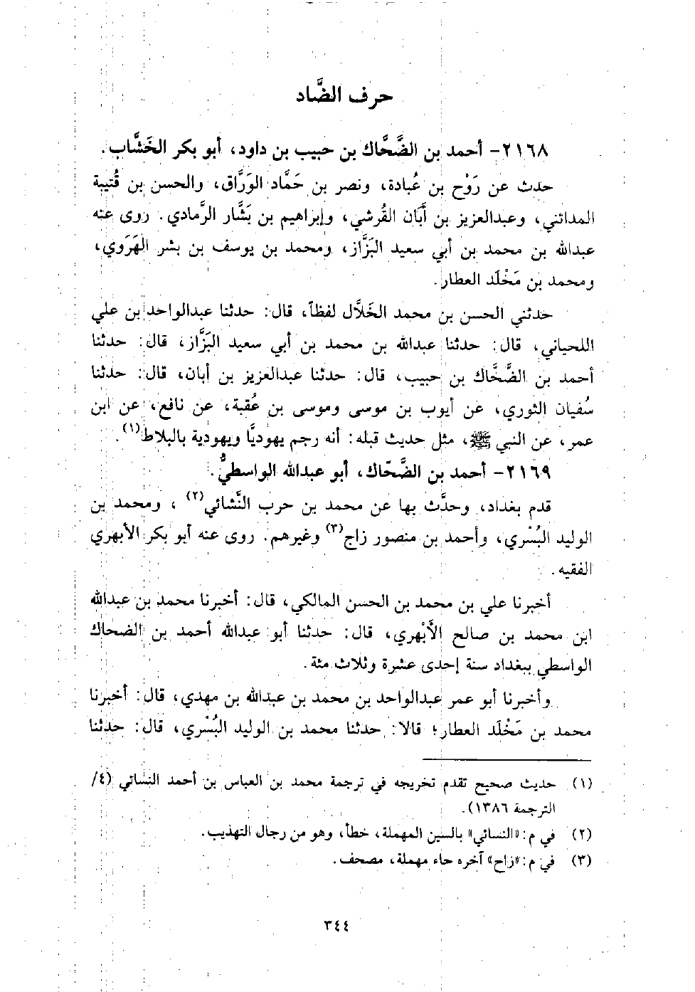 2169 - أَحْمَد بْن الضحاك أَبُو عَبْد اللَّه الواسطي قدم بغداد، وَحَدَّثَ بها عَنْ مُحَمَّد بْن حرب النشائي، ومحمد بْن الوليد البسري، وأحمد بْن مَنْصُور زاج، وغيرهم، رَوَى عَنْهُ أَبُو بَكْر الأبهري الْفَقِيه.