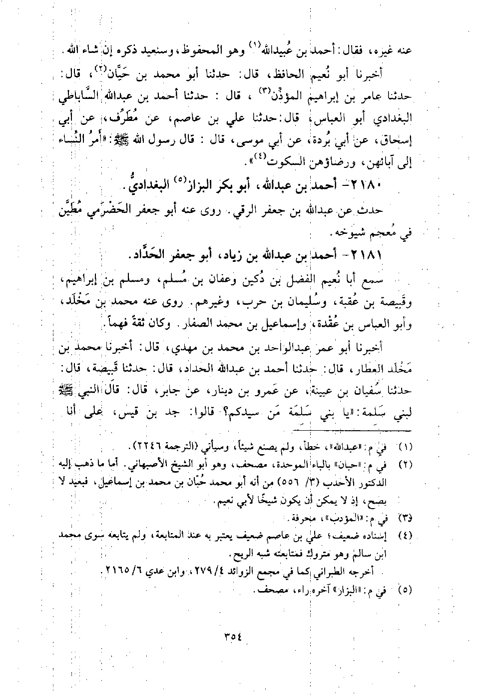 2180 - أَحْمَد بْن عَبْد اللَّه أَبُو بَكْر البزاز البغدادي حدث عَنْ عَبْد اللَّه بْن جعفر الرقي، رَوَى عَنْهُ أَبُو جعفر الحضرمي مطين فِي معجم شيوخه.