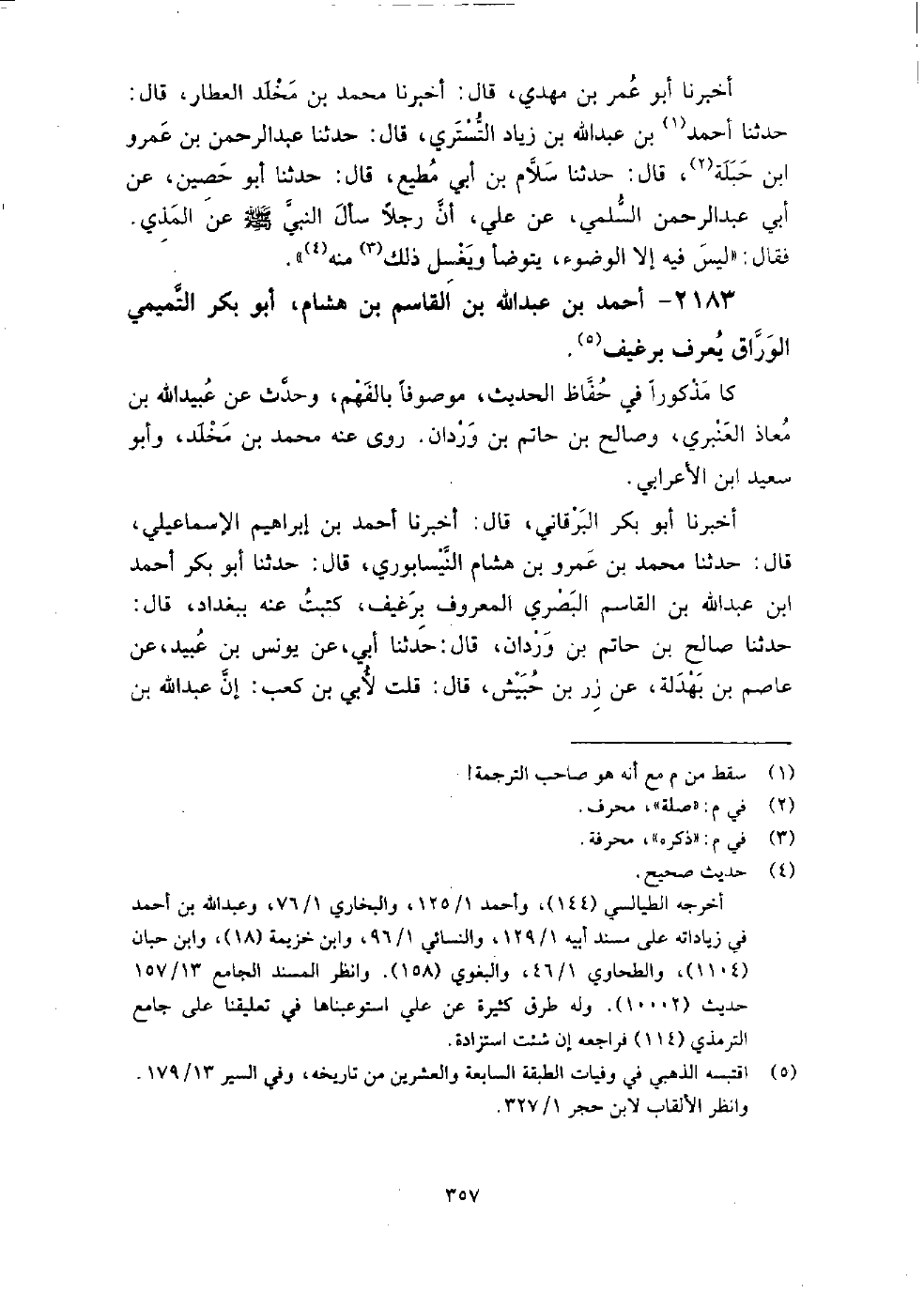 2183 - أَحْمَد بْن عَبْد اللَّه بْن الْقَاسِم بْن هشام أَبُو بَكْر التميمي الوراق يعرف برغيف كَانَ مذكورا فِي حفاظ الحديث، موصوفا بالفهم، وَحَدَّثَ عَنْ: عُبَيْد اللَّهِ بْن معاذ العنبري، وصالح بْن حاتم بْن وردان، رَوَى عَنْهُ مُحَمَّد بْن مَخْلَد، وَأَبُو سَعِيد ابْن الأعرابي.
