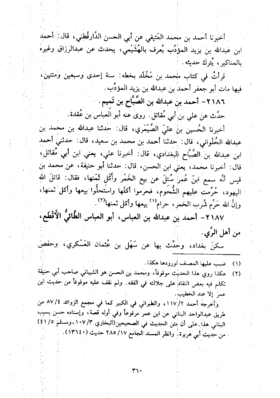 2187 - أَحْمَد بْن عَبْد اللَّه بْن الْعَبَّاس أَبُو الْعَبَّاس الطائي الأقطع من أهل الري، سكن بغداد، وَحَدَّثَ بها عَنْ سهل بْن عُثْمَان العسكري، وحفص المهرقاني، وهارون بْن سَعِيد الأيلي، وأحمد بْن سَعِيد الهمذاني، ويونس بْن عَبْد الأعلى المصري، رَوَى عَنْهُ أَحْمَد بْن كامل الْقَاضِي، ومحمد بْن عَلِيّ بْن عِيسَى الخراز المالكي، وَأَبُو الْقَاسِم الطبراني.