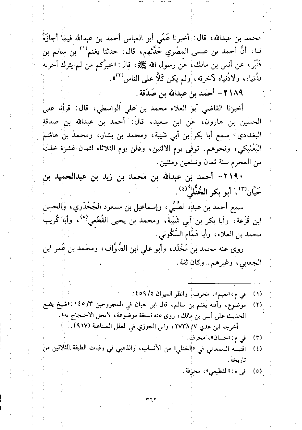 2189 - أَحْمَد بْن عَبْد اللَّه بْن صدقة أَخْبَرَنَا الْقَاضِي أَبُو العلاء مُحَمَّد بْن عَلِيّ الواسطي، قَالَ: قرأنا على الْحُسَيْن بْن هارون، عَنِ ابن سَعِيد، قَالَ: أَحْمَد بْن عَبْد اللَّه بْن صدقة البغدادي سمع أَبَا بَكْر بْن أَبِي شيبة، ومحمد بْن بشار، ومحمد بْن هاشم البعلبكي، ونحوهم.