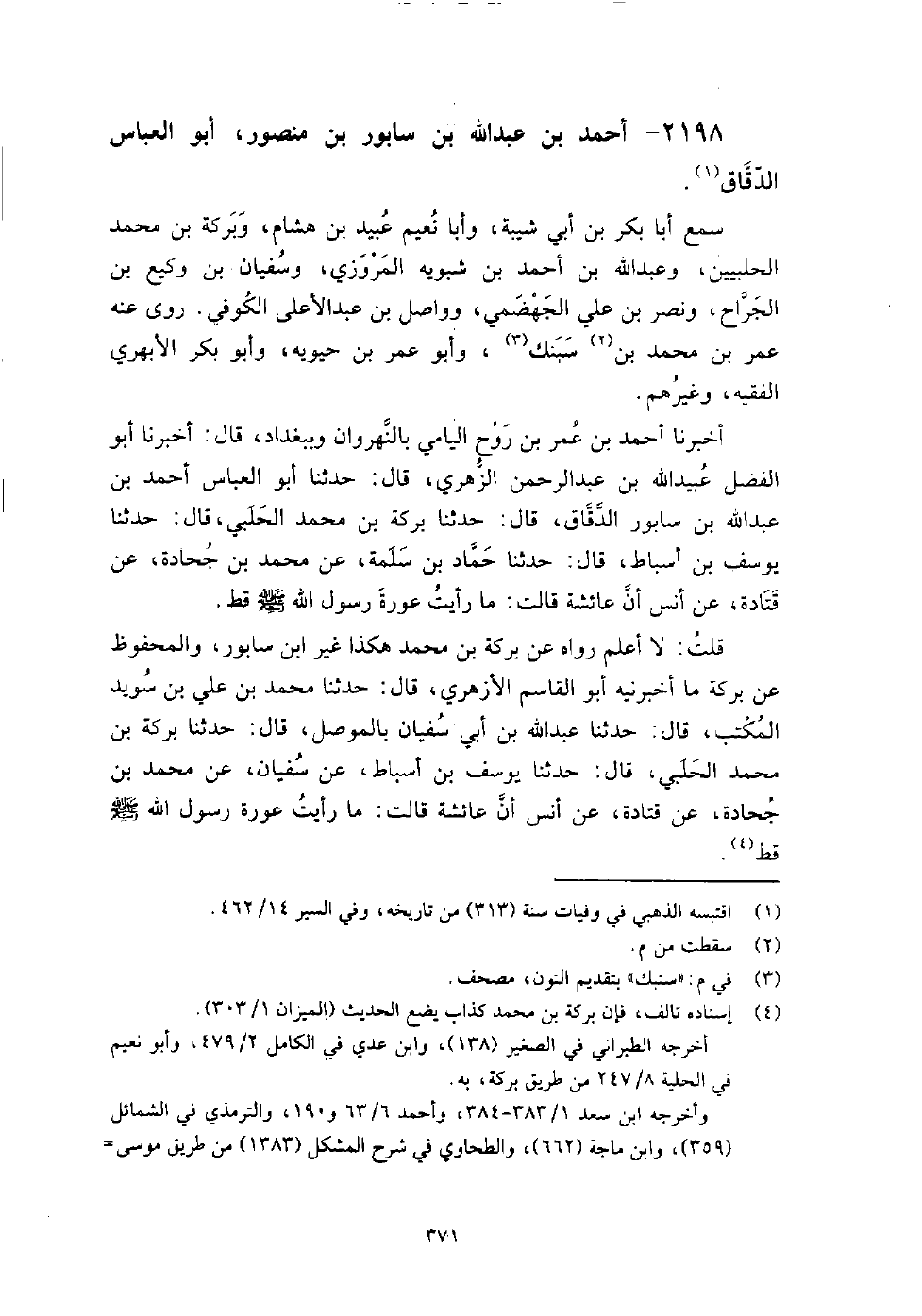 (1456) -[5: 371] قُلْتُ: لا أَعْلَمُ رَوَاهُ عَنْ بَرَكَةَ بْنِ مُحَمَّدٍ هَكَذَا غَيْرَ ابْنِ سَابُورَ، وَالْمَحْفُوظُ عَنْ بَرَكَةَ مَا أَخْبَرَنِيهِ أَبُو الْقَاسِمِ الأَزْهَرِيُّ، قَالَ: أَخْبَرَنَا مُحَمَّدُ بْنُ عَلِيِّ بْنِ سُوَيْدٍ الْمُكْتِبُ، قَالَ: حَدَّثَنَا عَبْدُ اللَّهِ بْنُ أَبِي سُفْيَانَ بِالْمَوْصِلِ، قَالَ: حَدَّثَنَا بَرَكَةُ بْنُ مُحَمَّدٍ الْحَلَبِيُّ، قَالَ: حَدَّثَنَا يُوسُفُ بْنُ أَسْبَاطٍّ، عَنْ سُفْيَانَ، عَنْ مُحَمَّدِ بْنِ جُحَادَةَ، عَنْ قَتَادَةَ، عَنْ أَنَسٍ، أَنَّ عَائِشَةَ، قَالَتْ: " مَا رَأَيْتُ عَوْرَةَ رَسُولِ اللَّهِ صَلَّى اللَّهُ عَلَيْهِ وَسَلَّمَ قَطُّ " حَدَّثَنِي على بْن مُحَمَّد بْن نصر، قَالَ: سَمِعْتُ حمزة بْن يوسف، يَقُولُ: سألت أَبَا الْحَسَن الدَّارَقُطْنِيّ عَنْ أَبِي الْعَبَّاس أَحْمَد بْن عَبْد اللَّه بْن سابور الدَّقَّاق، فَقَالَ: ثقة.