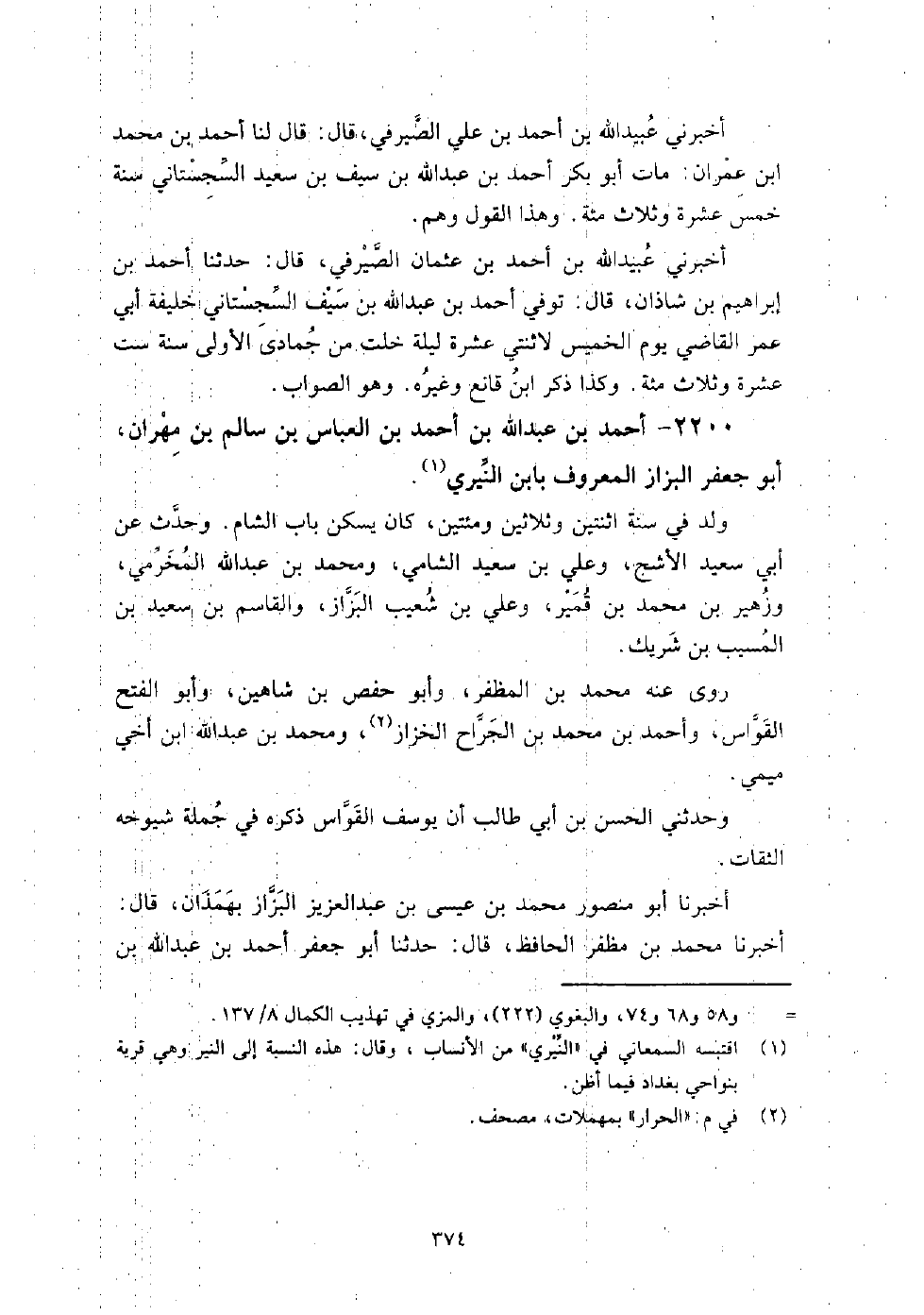 2200 - أَحْمَد بْن عَبْد اللَّه بْن أَحْمَدَ بْن الْعَبَّاس بْن سالم بْن مهران أَبُو جعفر البزار الْمَعْرُوف بابن النيري ولد فِي سنة اثنتين وثلاثين ومائتين، كَانَ يسكن باب الشام، وَحَدَّثَ عَنْ: أَبِي سَعِيد الأشج، وعلي بْن سَعِيد الشامي، ومحمد بْن عَبْد اللَّه المخرمي، وزهير بْن مُحَمَّد بْن قمير، وعلي بْن شُعَيْب البزاز، والقاسم بْن سَعِيد بْن المسيب بْن شريك.
