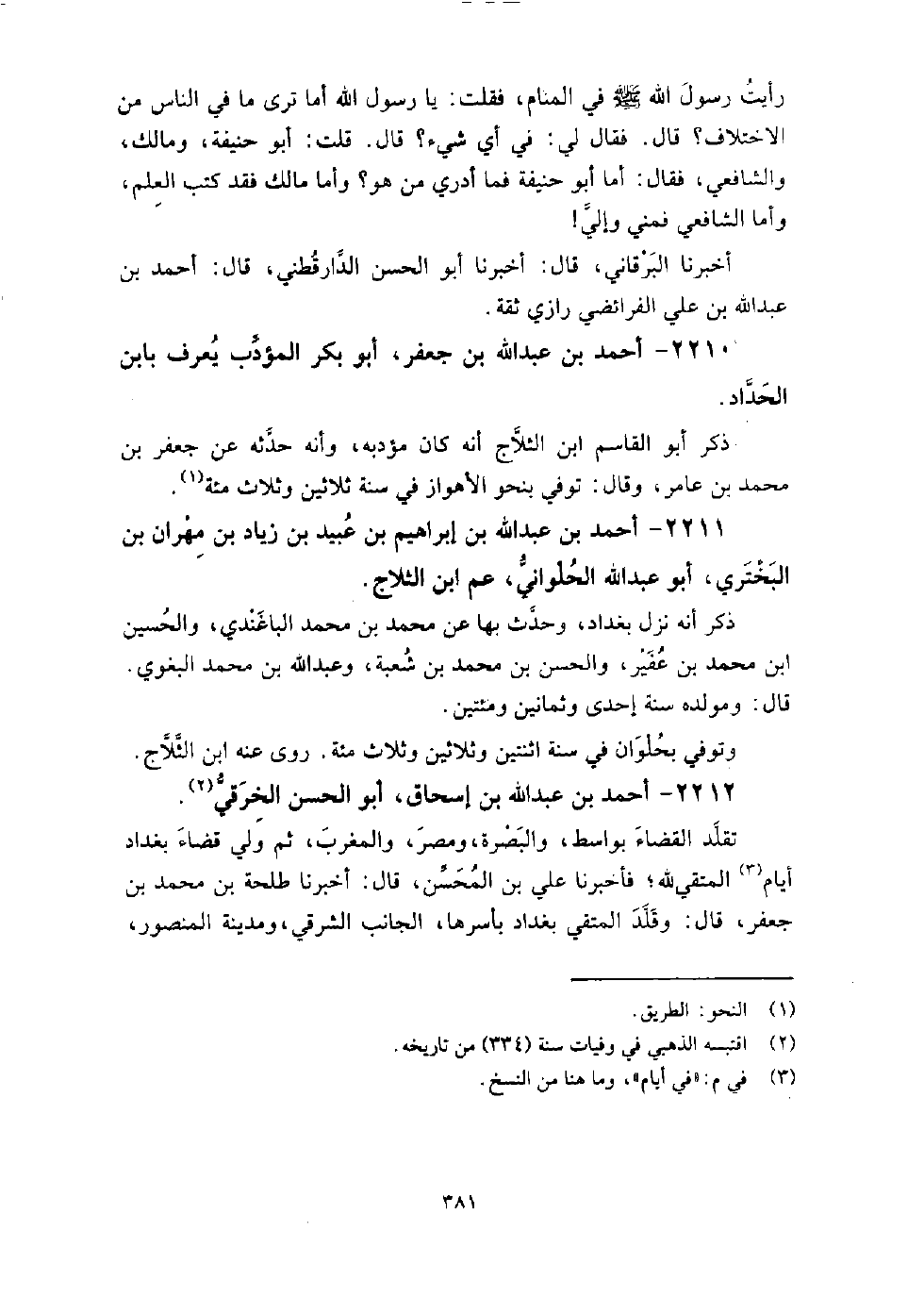 2212 - أَحْمَد بْن عَبْد اللَّه بْن إِسْحَاق أَبُو الْحَسَن الخرقي تقلد القضاء بواسط والبصرة ومصر والمغرب، ثم ولي قضاء بغداد أيام المتقى لله، فأخبرنا عَلِيّ بْن المحسن، قَالَ: أَخْبَرَنَا طلحة بْن مُحَمَّد بْن جعفر، قَالَ: وقلد المتقى بغداد بأسرها، الجانب الشرقي، ومدينة المنصور والكرخ، أَبَا الْحَسَن أَحْمَد بْن عَبْد اللَّه بْن إِسْحَاق الخرقي، مضافا إِلَى ما كَانَ قلده قَبْلَ الحضرة من القضاء بمصر، والمغرب والرملة والبصرة، وواسط وكور دجلة، وقطعه من السواد، وخلع عَلَيْهِ فِي سنة ثلاثين وثلاث مائة، وَكَانَ هَذَا رجلا من وجوه التجار البزازين بباب الطاق هو وأبوه وعمومته، وكانوا يشهدون عند القضاة بتمكنهم من خدمة ريدان قهرمانة المقتدر ومعاملتهم لها، واتصلت معاملة أَحْمَد بْن عَبْد اللَّه بعد المقتدر بحاشيته وولده، وَكَانَ المتقى يرعى لَهُ خدمته فِي حياة أَبِيهِ، وبعد ذلك فلما أفضت الخلافة إليه أحب أن ينوه باسمه ويبلغه إِلَى حال لم يبلغها أحد من أهله، فقلده القضاء، ولم تكن لَهُ خدمة للعلم، ولا مجالسة لأهله، فعجب الناس لذلك وقدروا أنه سيستعمل الكفاة على هَذِهِ الأمور العظام، فلم يفعل ذلك ونظر فِي الأمور بنفسه، فظهرت منه رُجْلة وكفاية، وجرت أحكامه وقضاياه على طريق صالحة، وبان من عفته وتنزه نفسه وارتفاعها عَنِ الدنس ما تمكنت حاله من نفوس الناس، ورضى مكانه أهل الجلالة والخطر، ولم يتعلق عَلَيْهِ بزلة، وارتفعت عَنْهُ الظنة، ولم يلحقه عيب فِي أيامه.