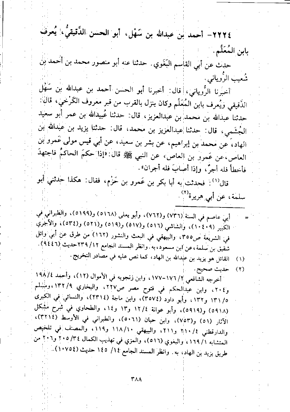 (1466) -[5: 388] أَخْبَرَنَا الرُّويَانِيُّ، قَالَ: أَخْبَرَنَا وَيُعْرَفُ بِابْنِ الْمُعَلِّمِ، وَكَانَ يَنْزِلُ بِالْقُرْبِ مِنْ قَبْرِ مَعْرُوفٍ الْكَرْخِيِّ، أَبُو الْحَسَنِ أَحْمَدُ بْنُ عَبْدِ اللَّهِ بْنِ سَهْلٍ الدَّقِيقِيُّ قَالَ: حَدَّثَنَا عَبْدُ اللَّهِ بْنُ مُحَمَّدِ بْنِ عَبْدِ الْعَزِيزِ، قَالَ: حَدَّثَنَا عُبَيْدُ اللَّهِ بْنُ عُمَرَ أَبُو سَعِيدٍ الْجُشَمِيُّ، قَالَ: حَدَّثَنَا عَبْدُ الْعَزِيزِ بْنُ مُحَمَّدٍ، قَالَ: حَدَّثَنَا يَزِيدُ بْنُ عَبْدِ اللَّهِ بْنِ الْهَادِ، عَنْ مُحَمَّدِ بْنِ إِبْرَاهِيمَ، عَنْ بِشْرِ بْنِ سَعِيدٍ، عَنْ أَبِي قَيْسٍ مَوْلَى عَمْرِو بْنِ الْعَاصِ، عَنْ عَمْرِو بْنِ الْعَاصِ، عَنِ النَّبِيِّ صَلَّى اللَّهُ عَلَيْهِ وَسَلَّمَ قَالَ: " إِذَا حَكَمَ الْحَاكِمُ فَاجْتَهَدَ فَأَخْطَأَ؛ فَلَهُ أَجْرٌ، وَإِذَا أَصَابَ؛ فَلَهُ أَجْرَانِ " قَالَ: فحدثت بِهِ أَبَا بَكْر بْن عمرو بْن حزم، فَقَالَ: هكذا حَدَّثَنِي أَبُو سلمة، عَنْ أَبِي هُرَيْرَةَ.