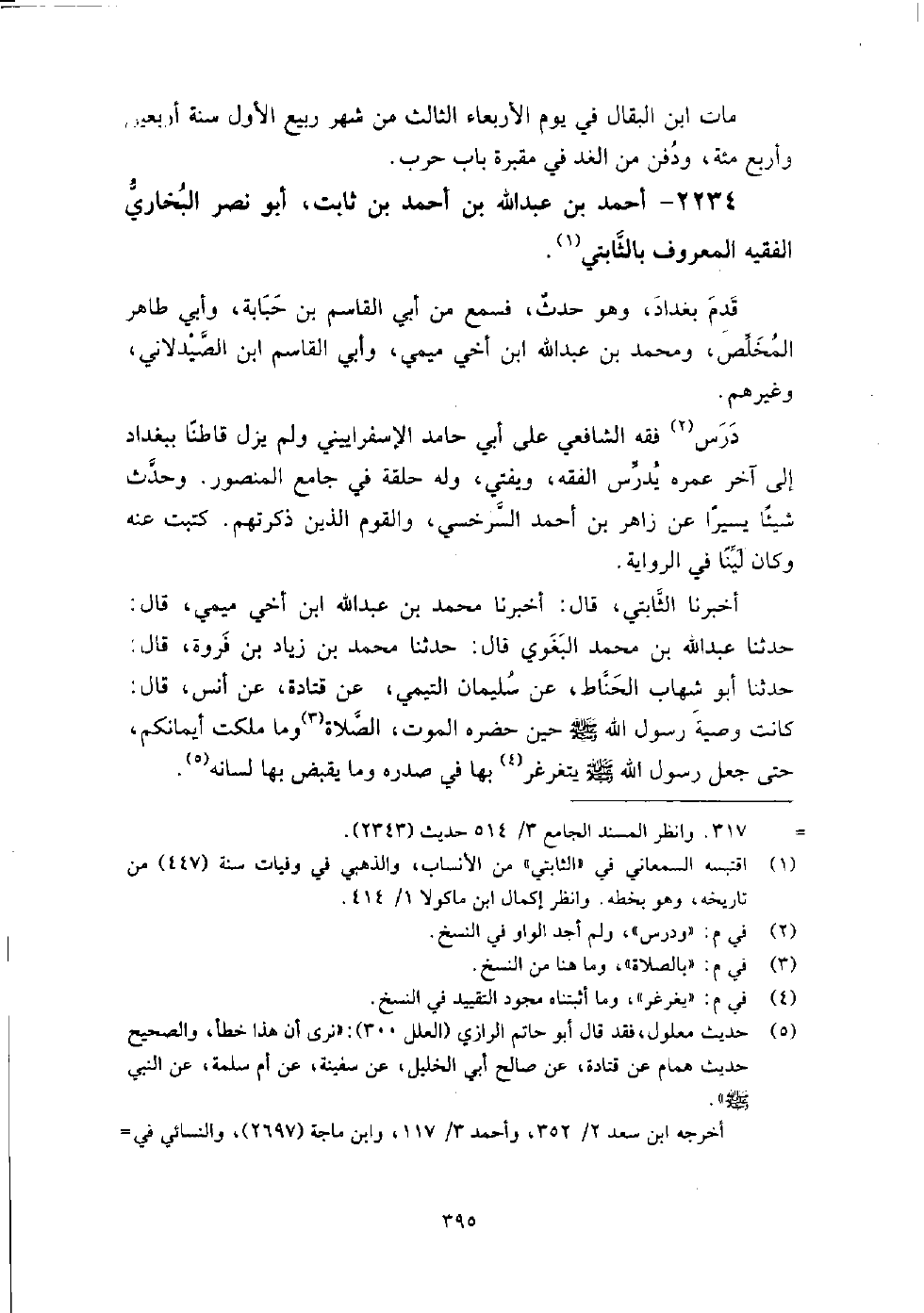 2234 - أَحْمَد بْن عَبْد اللَّه بْن أَحْمَدَ بْن ثابت أَبُو نصر البخاري الْفَقِيه الْمَعْرُوف بالثابتي قدم بغداد وهو حدث، فسمع من أَبِي الْقَاسِم بْن حبابة، وأبي طَاهِر المخلص، ومحمد بْن عَبْد اللَّه بْن أخي ميمي، وأبي الْقَاسِم ابْن الصيدلاني، وغيرهم.